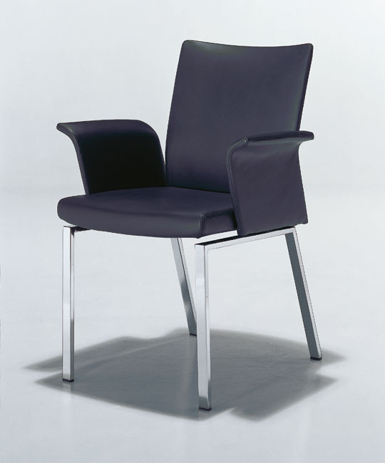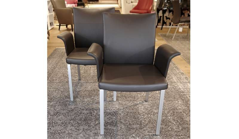 Der Esszimmerstuhl Linus II von Draenert hat einen Bezug in dunkelbraunem Leder, das Gestell ist Aluminium matt verchromt.