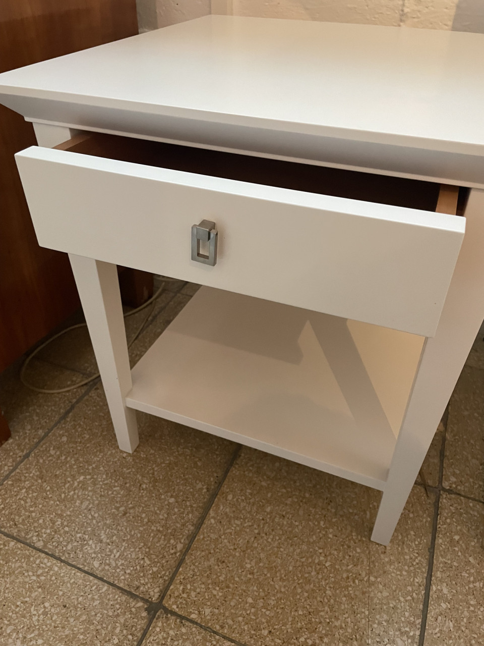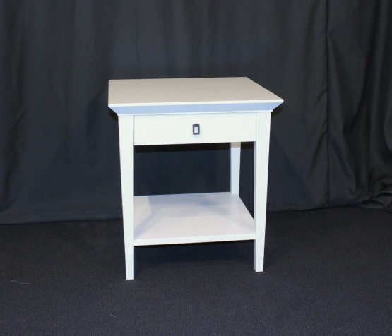 Beistelltisch mit einer Schublade und einem Ablageboden, Schubladengriff Nickel matt geschliffen, Holz: Ahorn weiß lackiert.