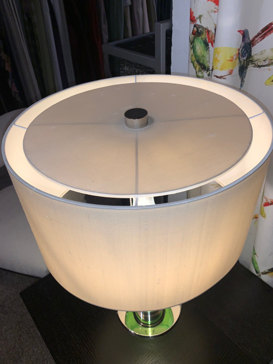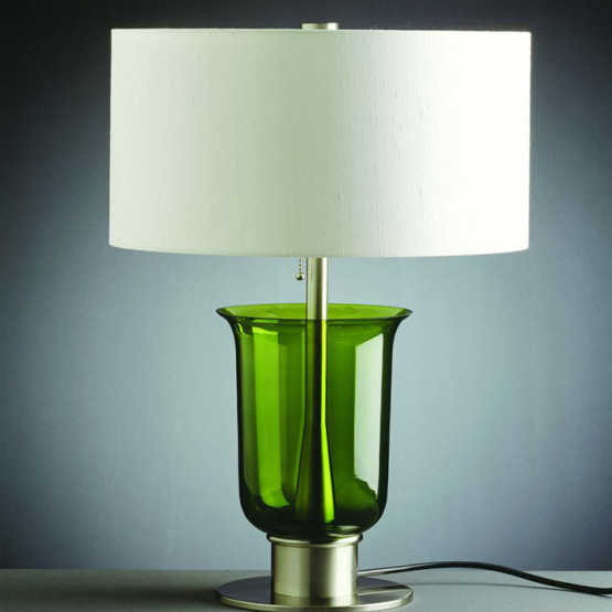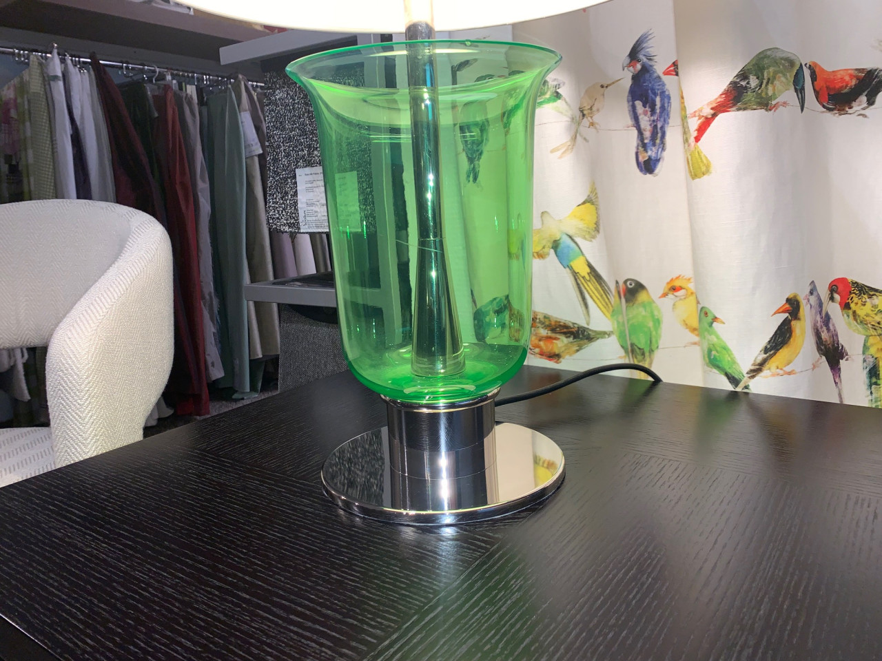 Tischleuchte Diva S mit grün-transparentem Glaskorpus und Seidenschirm mit Deckel. Der Fuß und der Leuchtenstab sind glänzend verchromt.
