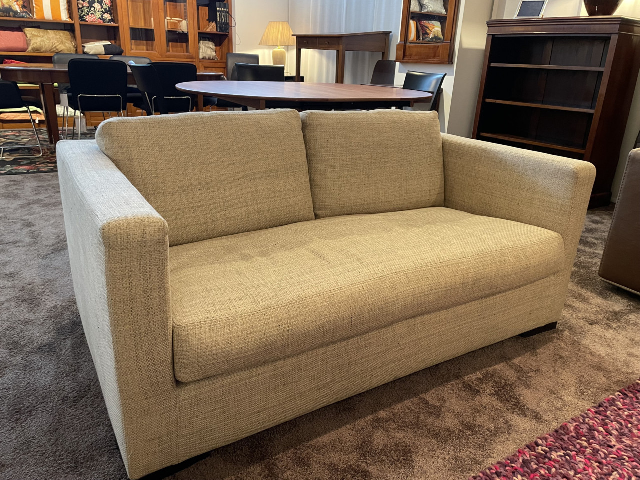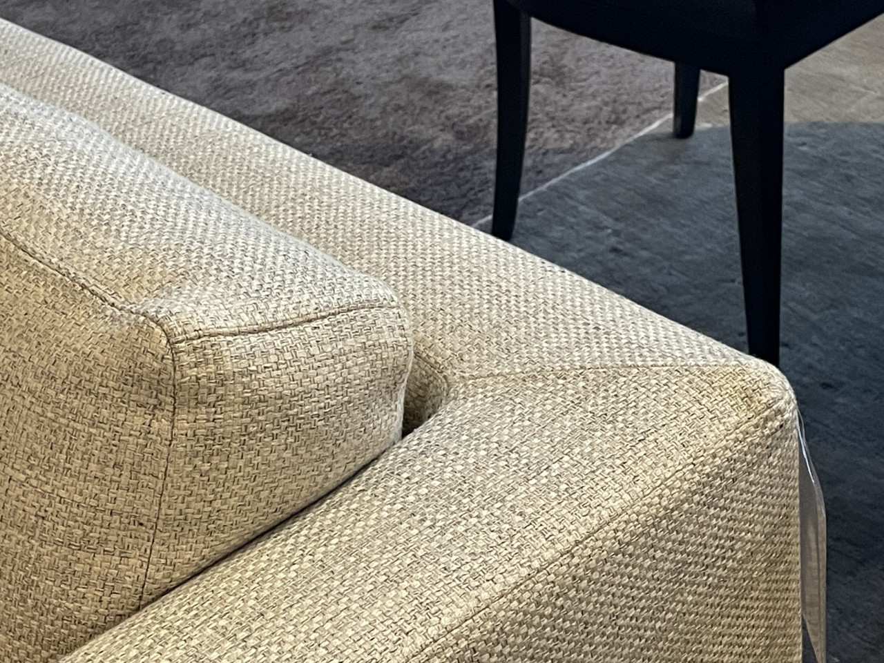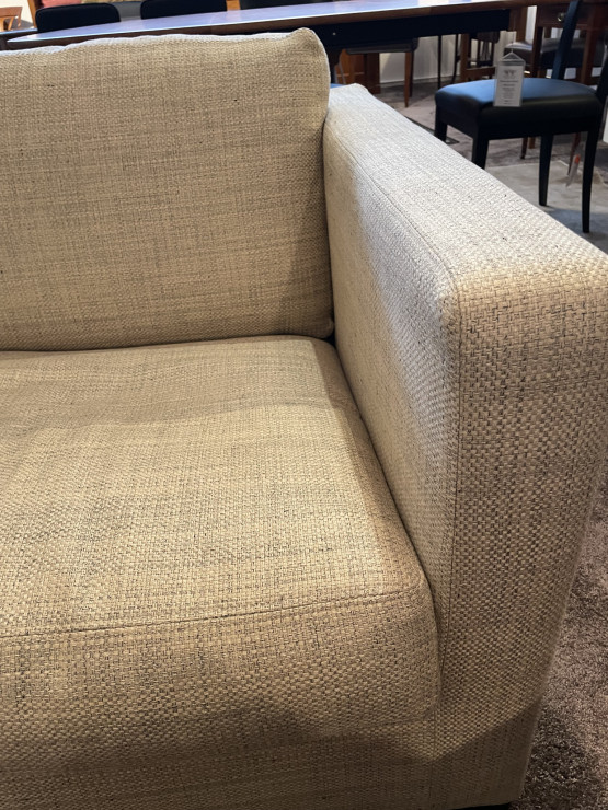 Das kleine Sofa Belmon 160 zeichnet sich durch eine klare Linienführung aus, gut passend zu der eckigen Form. Das durchgehende Sitzkissen verleiht dem kleinen Sofa eine gewisse Großzügigkeit. Der moderne Bezugsstoff Frieda 103 hat eine gröbere leinenartige Struktur in neutraler Farbgebung. Ausstellungsstück.