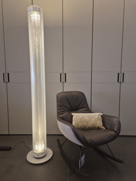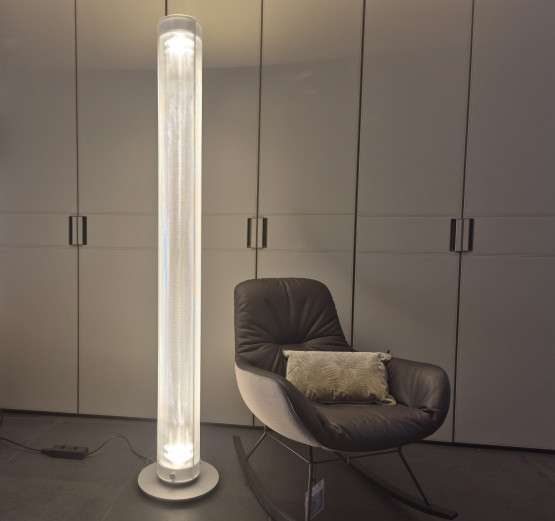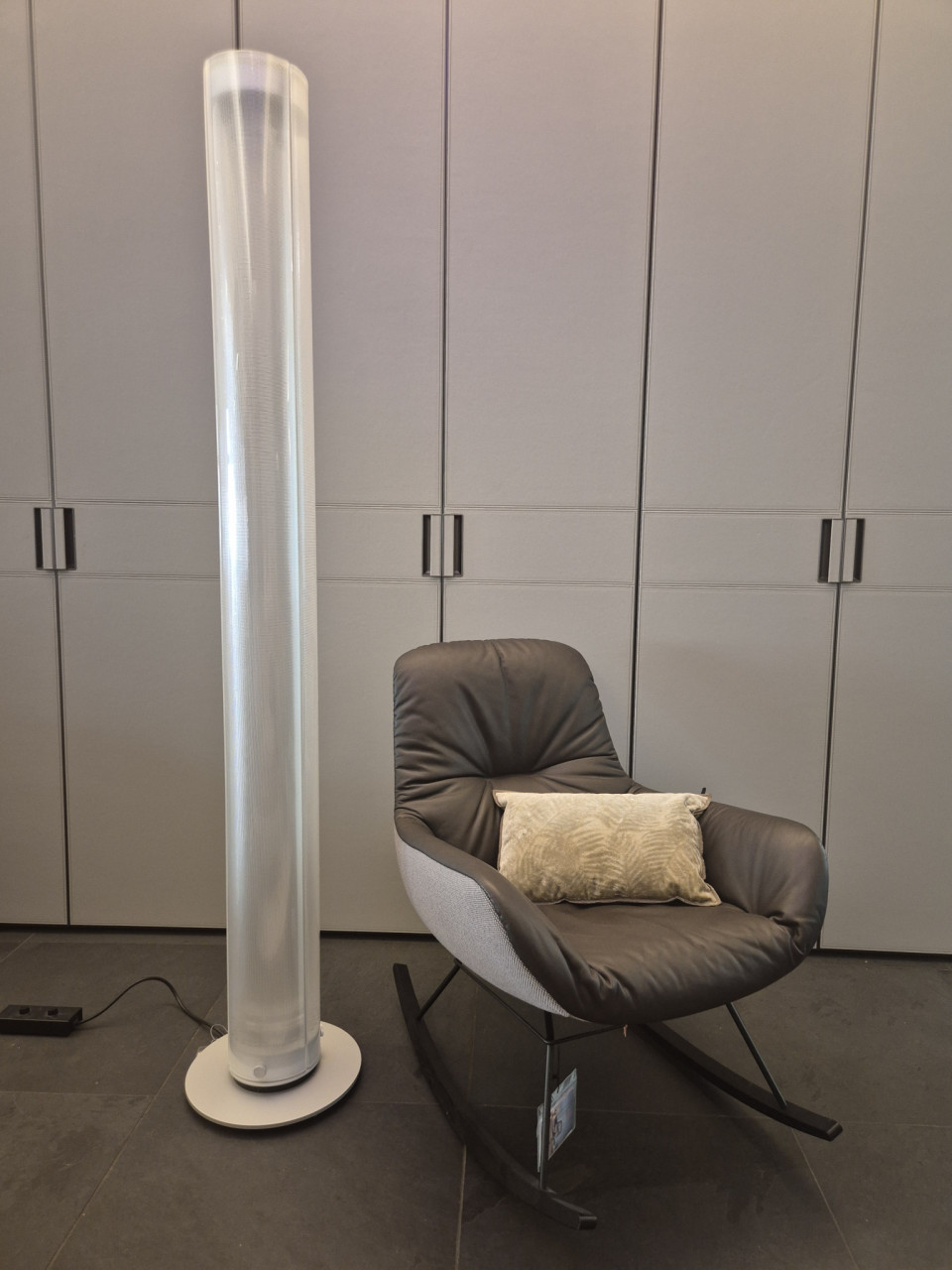 Bei der Leuchte kann über ein Fußpad das Licht im Korpus und nach oben getrennt geschaltet und gedimmt werden.