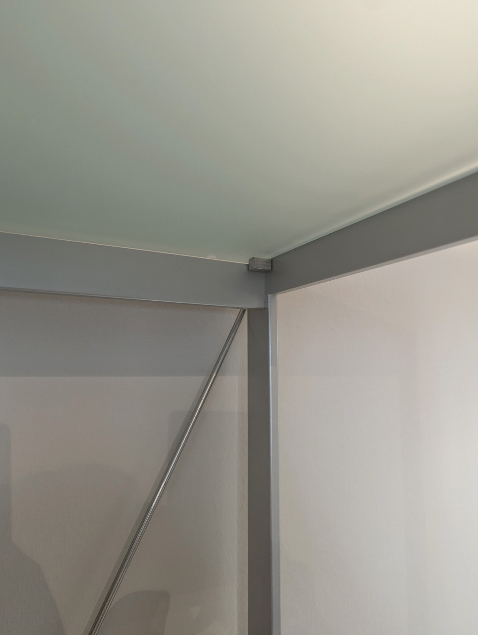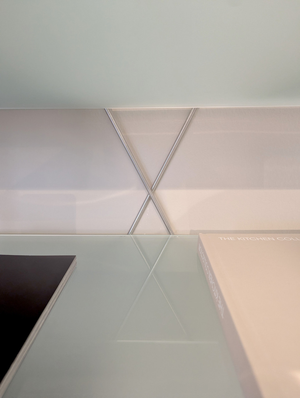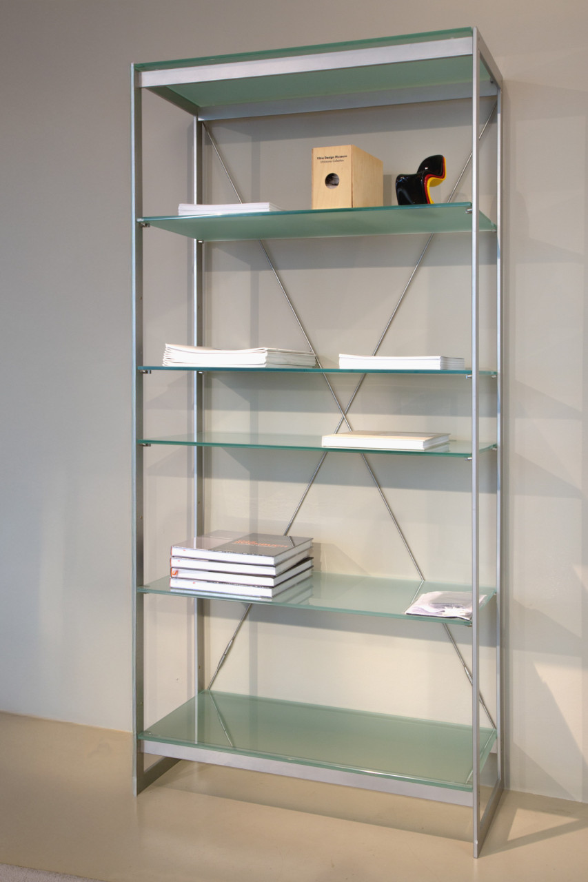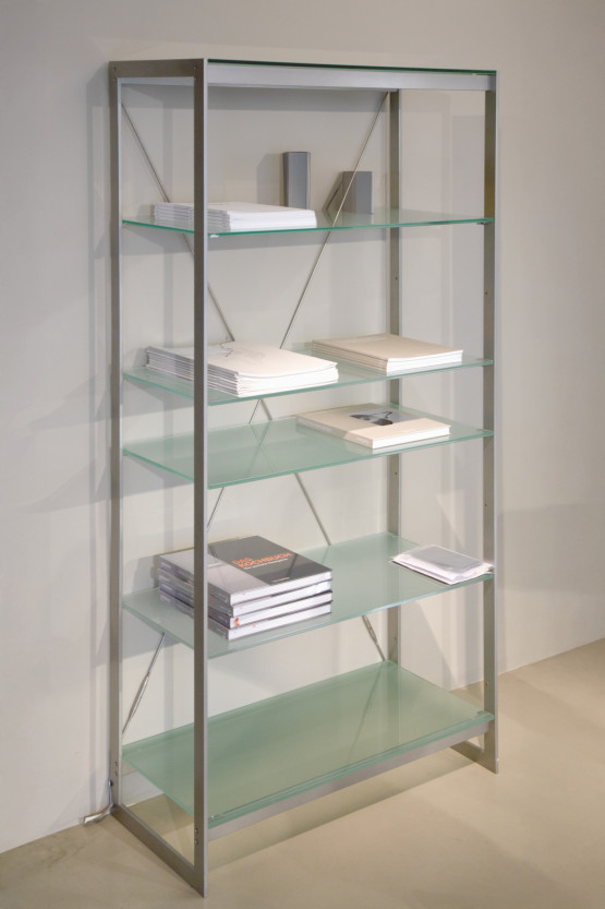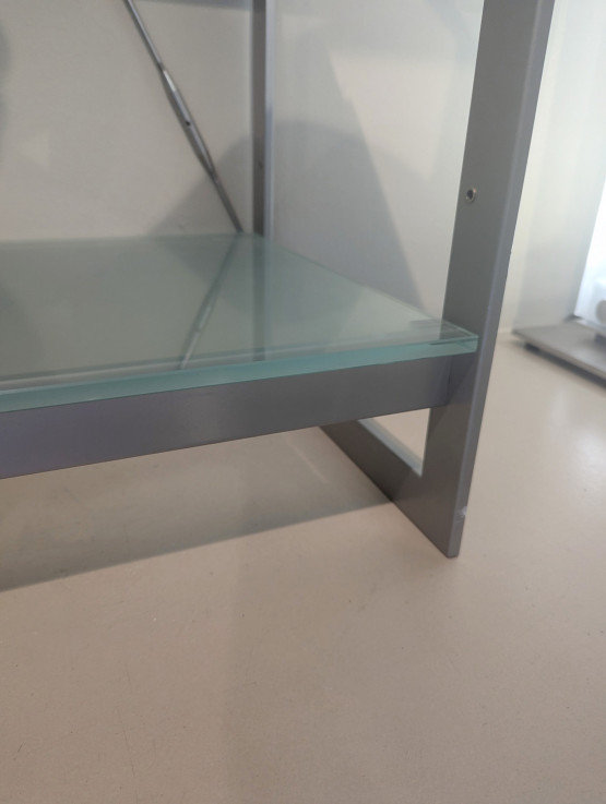 Modernes, offenes Regal aus satiniertem Glas mit filigranem Metallrahmen. Ideal zur Präsentation von Büchern, Deko oder Sammlerstücken. Zeitloses Design – passt in Wohn- oder Arbeitsbereich.