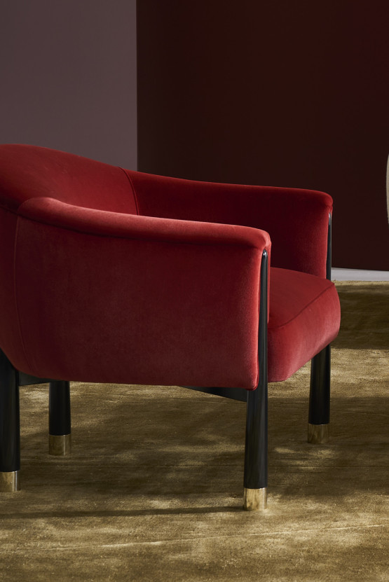 Der Baton Sessel besticht durch seine moderne, geschwungene Form und luxuriöse Materialien. Der samtartige Bezug, das dunkle Holzgestell und goldene Metallfüße verleihen ihm einen eleganten Look.
