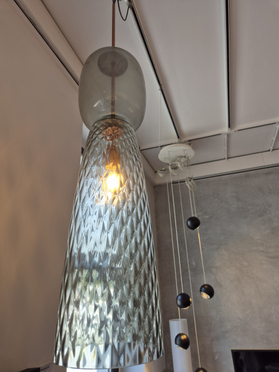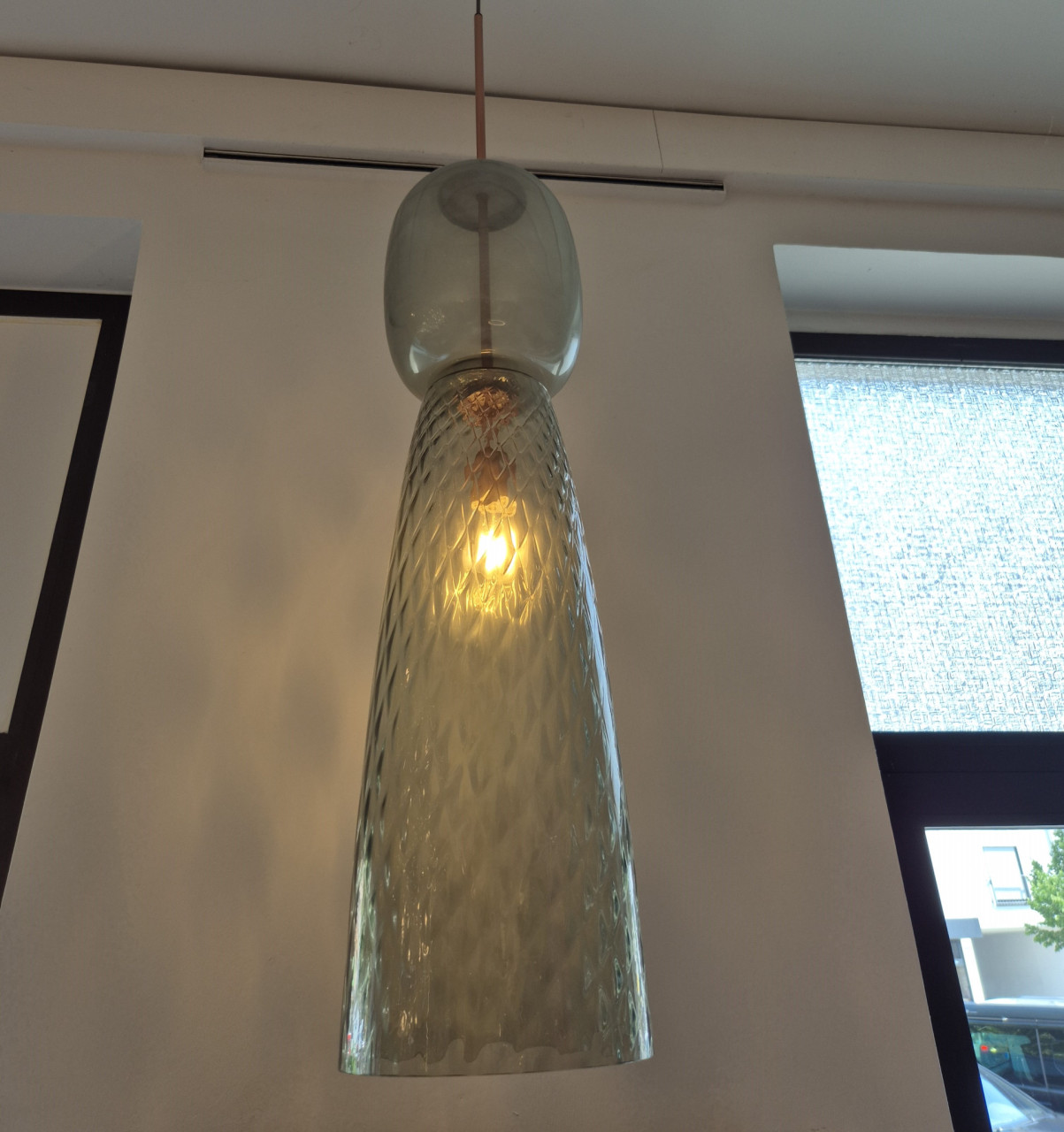 Die Leuchte erinnert an die orientalischen Salons mit kolonialer Atmosphäre um die Jahrhundertwende und an die venezianische Tradition der Glasverarbeitung mit Formen, die durch exotische Früchte inspiriert werden.