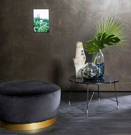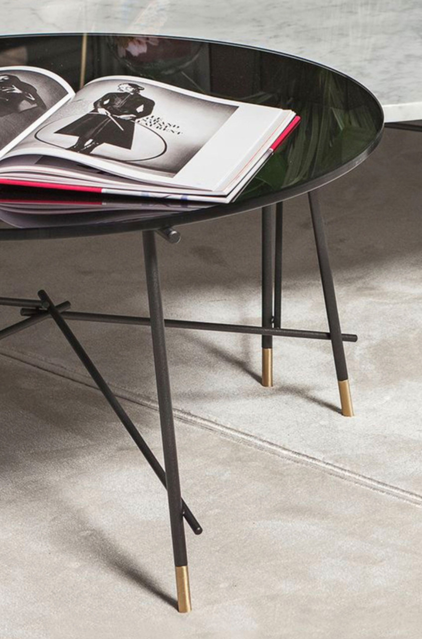 Das filigrane Metallgestell, mit anthrazitfarbenem Struckturfinish und Messingspitzen an den Enden, lässt den Tisch leicht und elegant erscheinen.