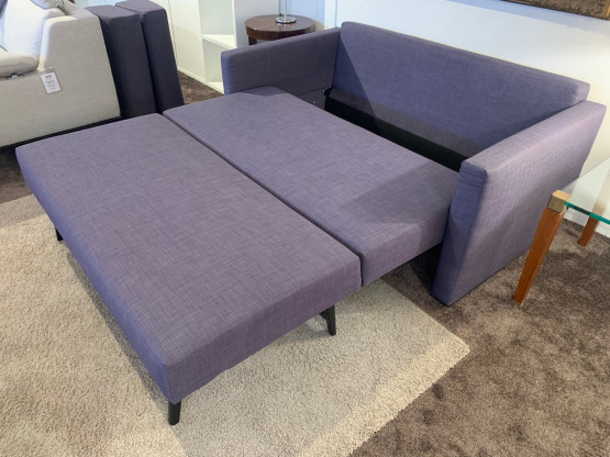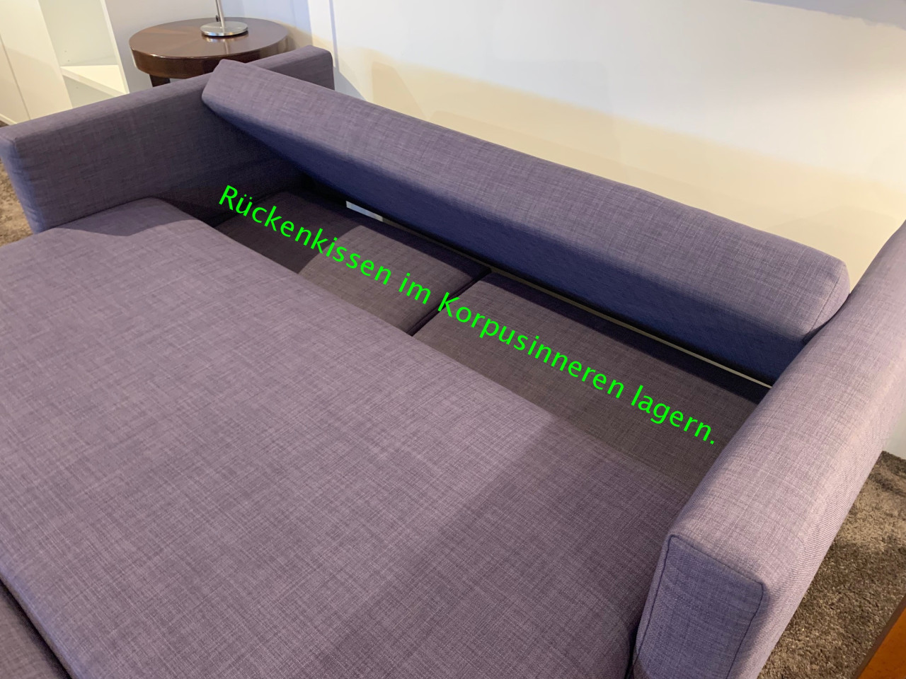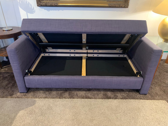 Die Sitzfläche wird dazu hochgeklappt und nach vorne ausgezogen. Das Gestell klappt sich synchronisiert mit aus, bis die Sitzfläche mit Unterteil festen Stand haben. Die losen Rückenpolsterkissen können nun im Korpusinneren schützend und platzsparend verstaut werden. Die Rückenlehne wird nun flachgeklappt und die großzügig Liegefläche ist vorbereitet.