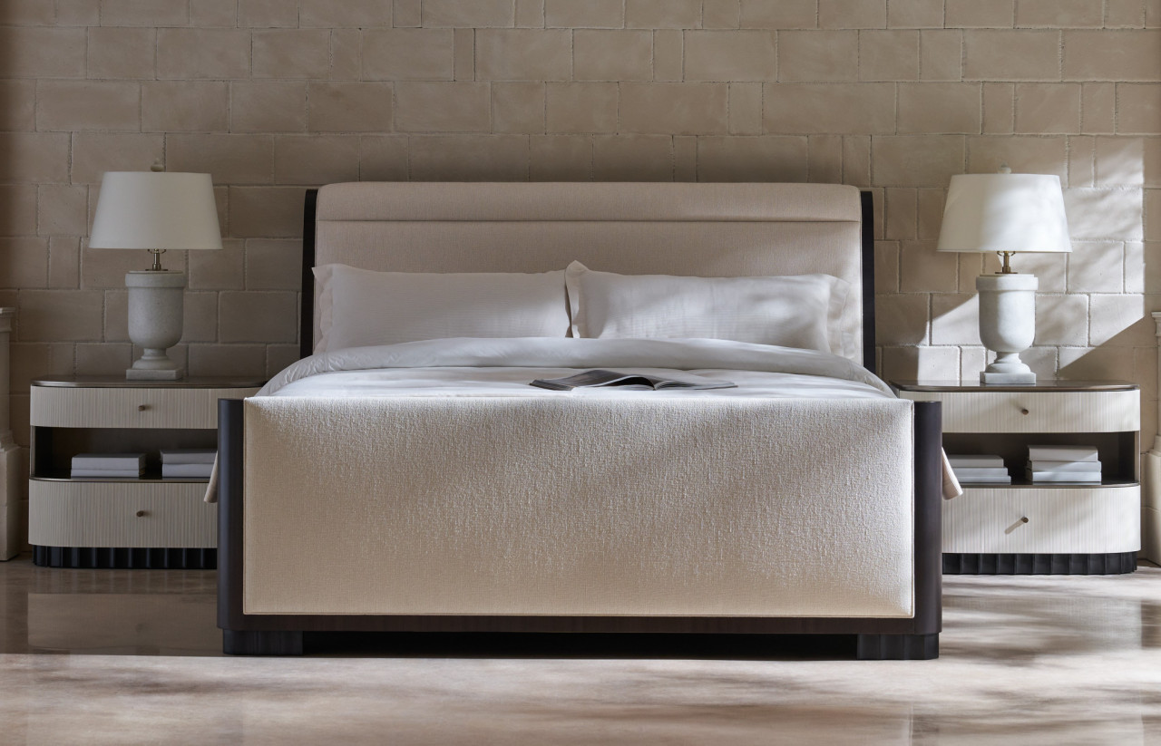 Das Slow Wave Queen Bed ist ein elegantes Schlittenbett im neoklassischen Stil mit gepolstertem Kopfteil und schlichtem Fußteil. Bezogen ist es mit einem hochwertigen, seidenähnlichen Stoff in warmem Braun (Otter) und kombiniert mit Holzelementen in Otter und Dunkler Schokolade. Es bringt stilvolle Eleganz und Komfort in jedes Schlafzimmer.