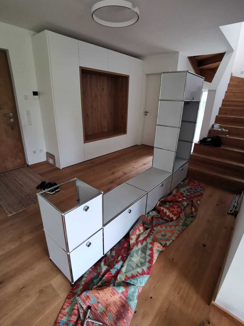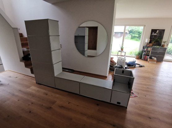 Die USM Garderobe ist 3 Jahre alt und wird jetzt aufgrund eines Umbaus verkauft. Der Neupreis liegt bei 4.600€. Drei große Elemente unten wurden als Stauraum für Schuhe verwendet. Die beiden Elemente links sind mit Glasböden versehen. Das hohe Element ist nach vorne offen und hat eine Garderobenstange. Das obere Element hat eine versenkbare Klappe. Zwei von den unteren Module haben eine Verstärkung damit man darauf sitzen kann.