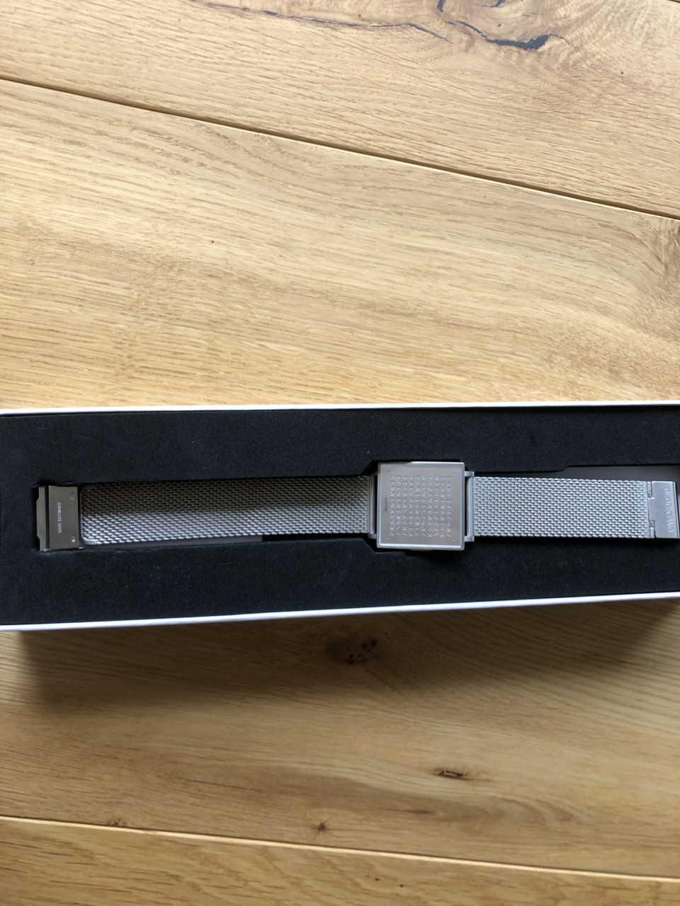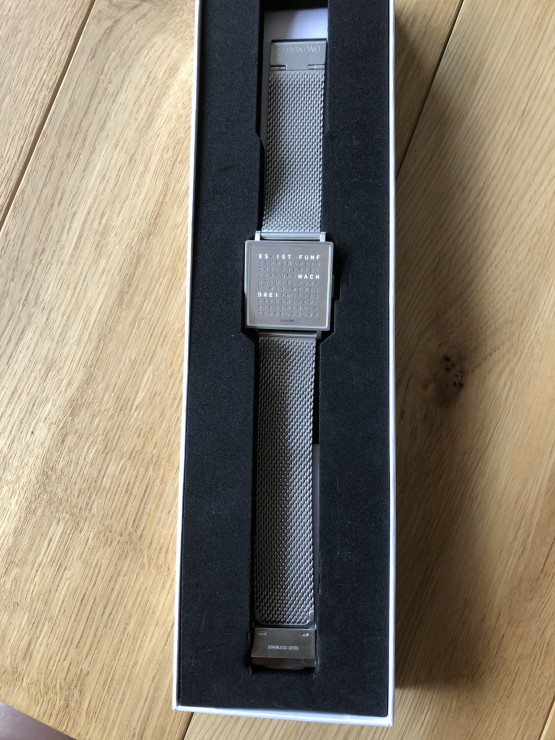 QLOCKTWO W 35 bringt das entschleunigende Prinzip der Zeitanzeige mit Worten auf Knopfdruck an Ihr Hand- gelenk.