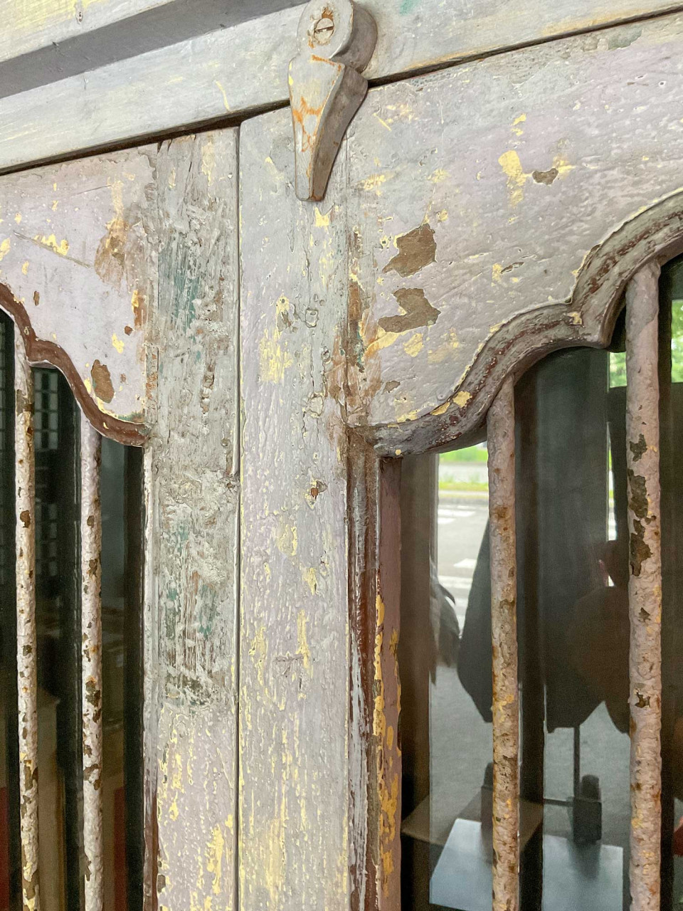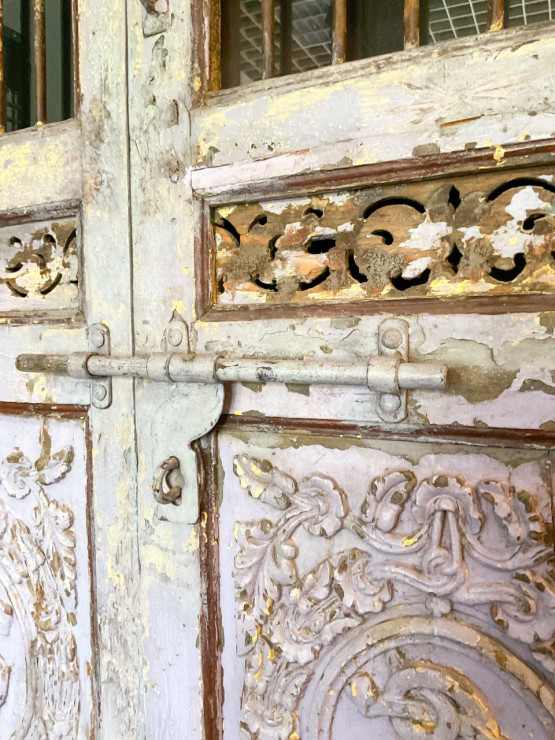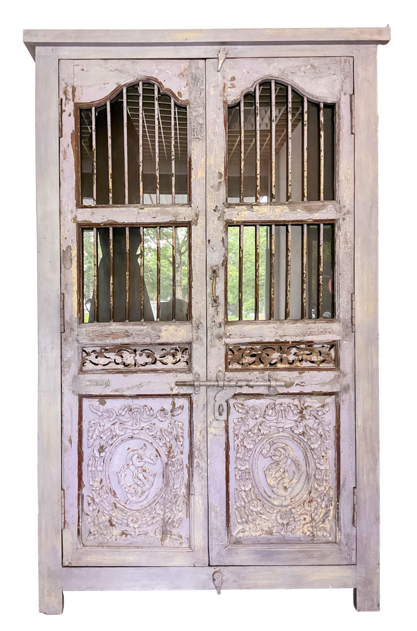 Schrank mit den alten Türen eines indischen Hauses. Wunderschöne Schnitzereien, außergewöhnlich schöne Farbe und Patina.