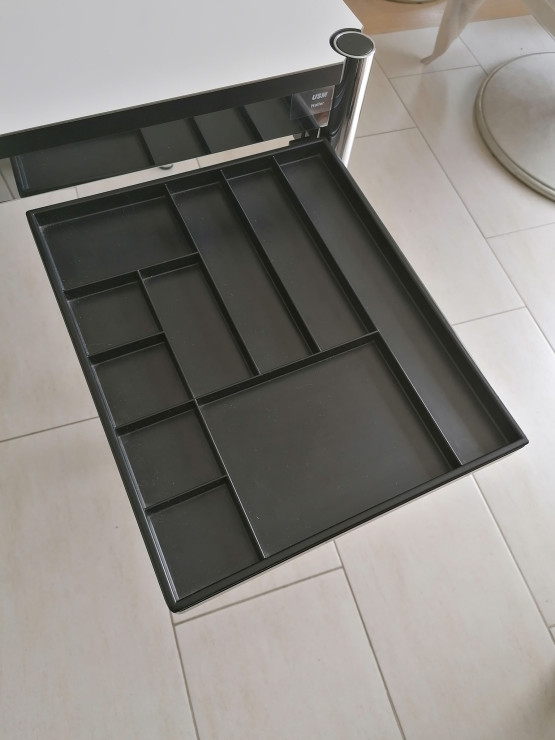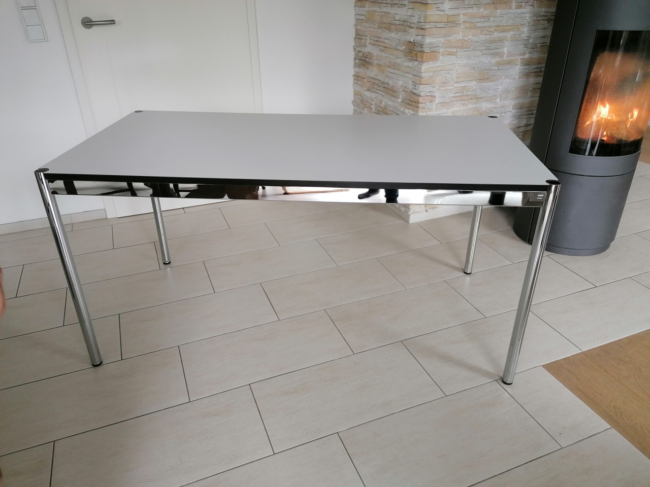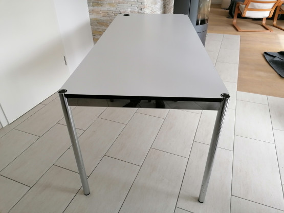 Verkaufe mehrere USM-Haller-Schreibtische 175x75cm, Tischplatte Kunstharz perlgrau (optisch weiß) mit und ohne Kabeldurchführungsloch, optional mit Kabelkorb und/oder Materialschwenkarm