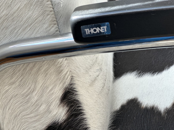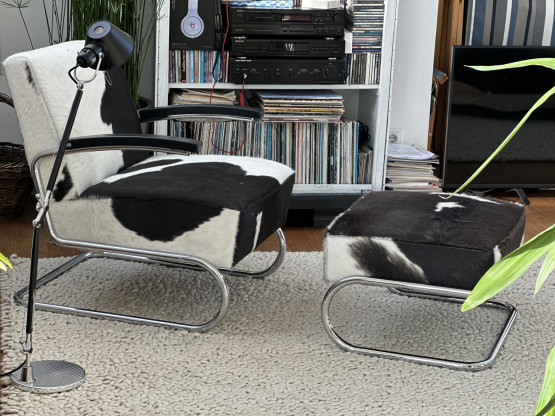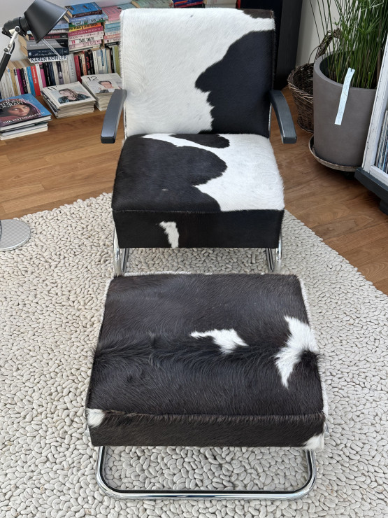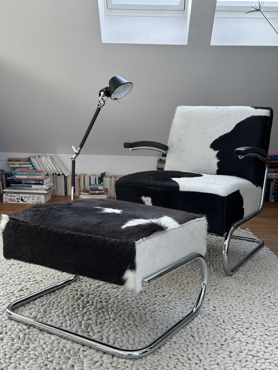 Das Freischwinger-Gestell des Sessels sowie Hockers ist verchromt, die Polsterelemente verfügen über einen Federkern sind mit Schwarz-Weissem Kuhfell bezogen