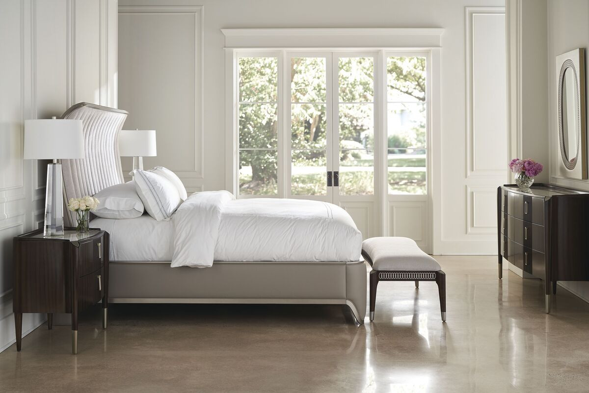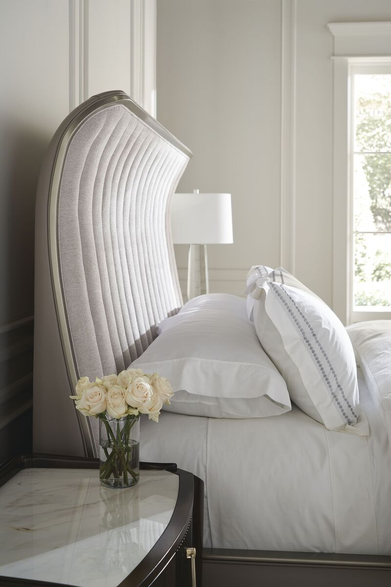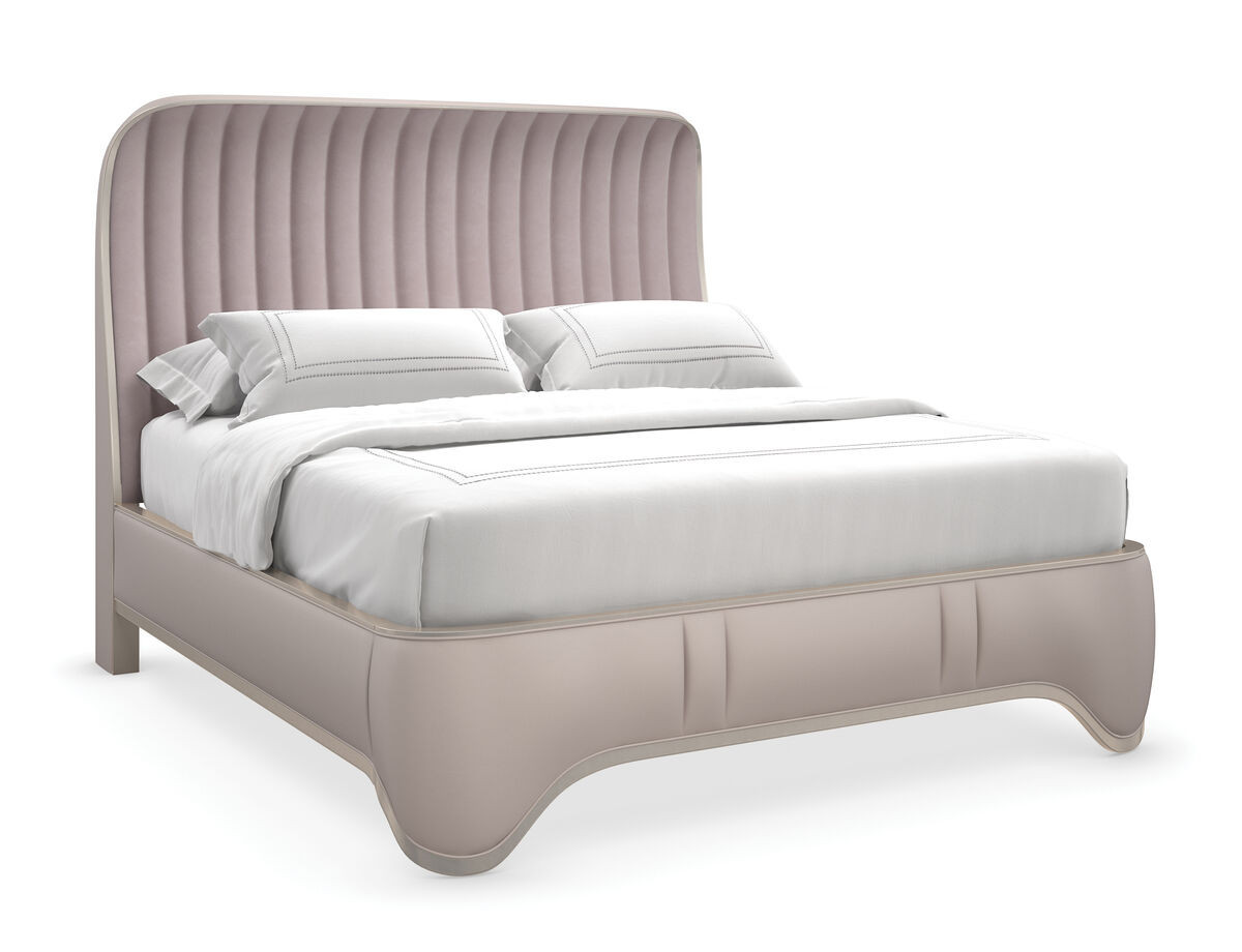Eine leicht übergreifende Kurve verleiht dieser anspruchsvollen Silhouette eine weiche Note, die durch einen freiliegenden Holzrahmen in einem warmen Metall-Finish definiert wird. Die exquisite Verarbeitung umfasst ein vertikal kanalförmig gepolstertes Kopfteil aus diamantartigem Chenille-Stoff, ergänzt durch ein Fußteil und elegante Seitenschienen mit abgerundeten Kanten in einem taupefarbenen Kunstleder. Der Farbton dieses Modells ist Afterglow.