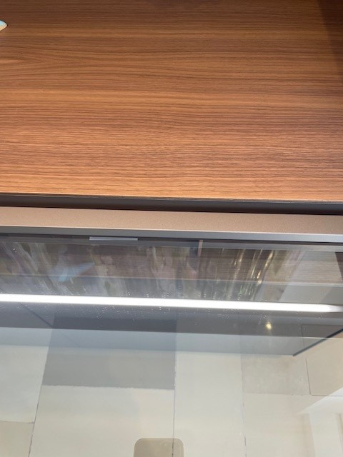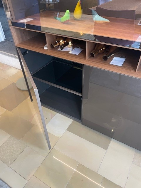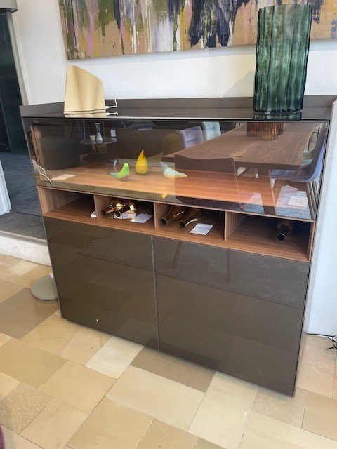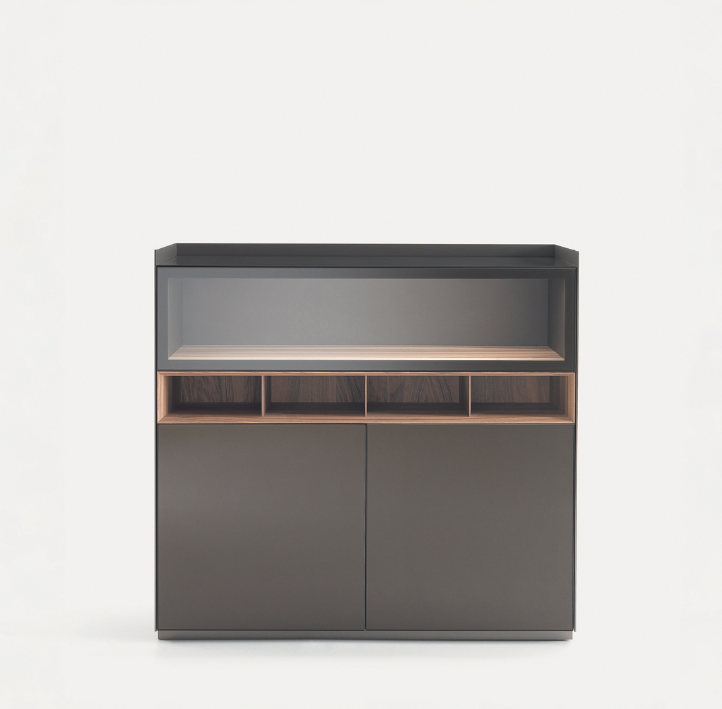 Vitrine mit Klapptür als Raumteiler. Dank Rimadesio-Technologie gleiten die Klapptüren leise und unsichtbar durch einen durchgehenden Profilrahmen (Push-to-Open). Integrierte LED-Beleuchtung setzt das Innere optimal in Szene. Struktur: 303 bronzo; Fronten lackiertes Glas 303 bronzo; Deckplatte/Tür 67 riflettente chiaro; innere Bodenplatte und offenes Fach 15 noce; Seiten/Rückwand 136 bronzo opaco. Kurz und stilvoll – perfekt als eleganter Raumteiler.