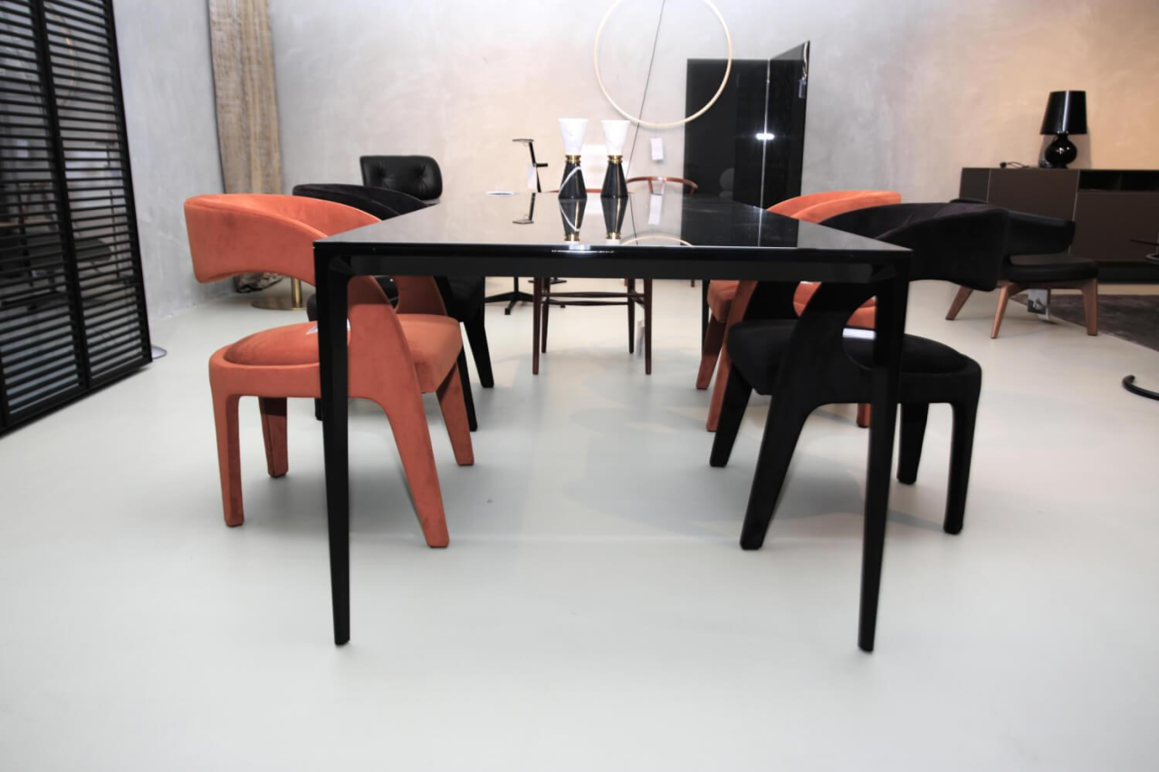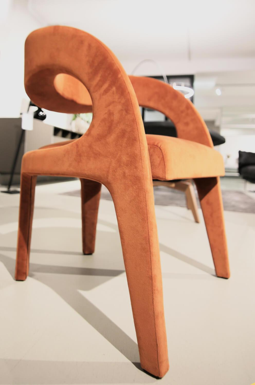 Vierteiliges Stuhlset des bekannten Modells Berenice Chair – zwei mit schwarzem Stoff (A073 Black) und zwei in warmem Paprika-Orange (A045 Paprika).