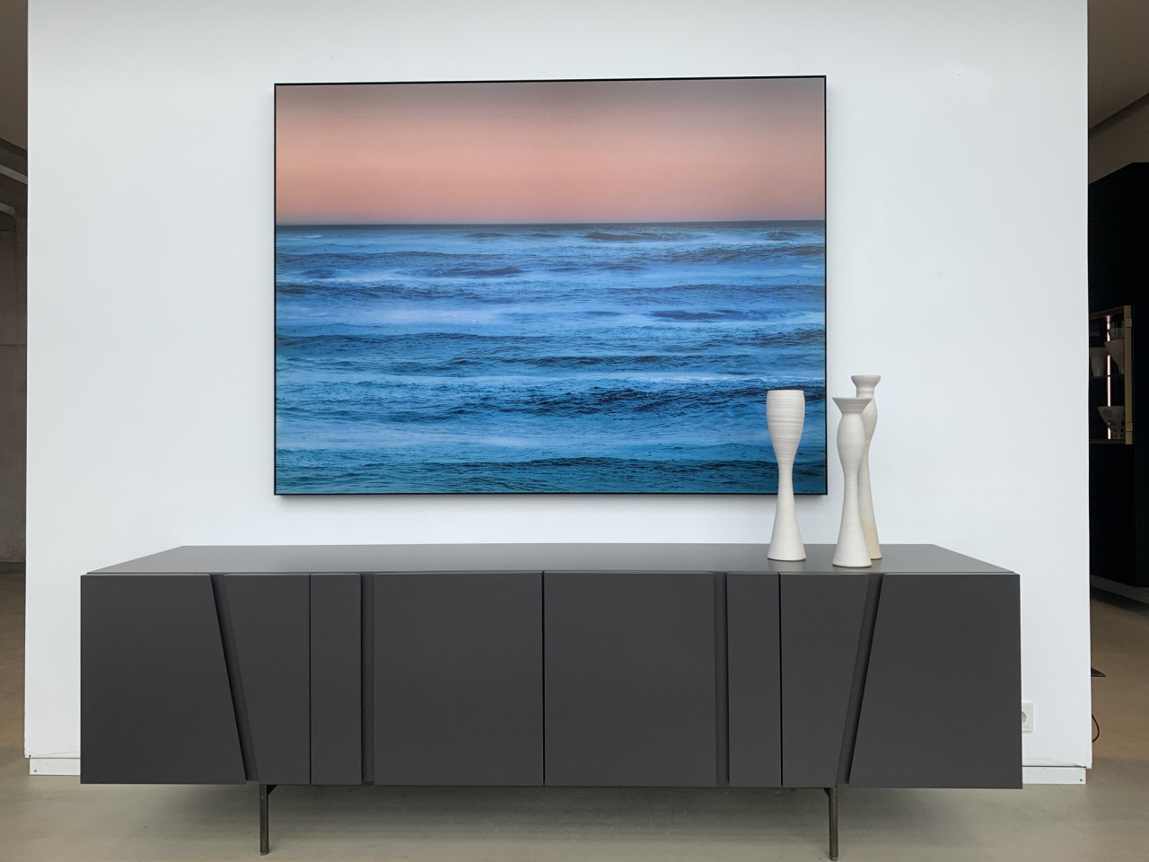 Sideboard PICTURE (Fa. Lema) in Mattlack, Farbe "fumo", Inneneinteilung: Innenschublade in dunkler Eiche, 2 Glasböden, Maße: 221,5 cm breit, 70 cm hoch, 53 cm tief