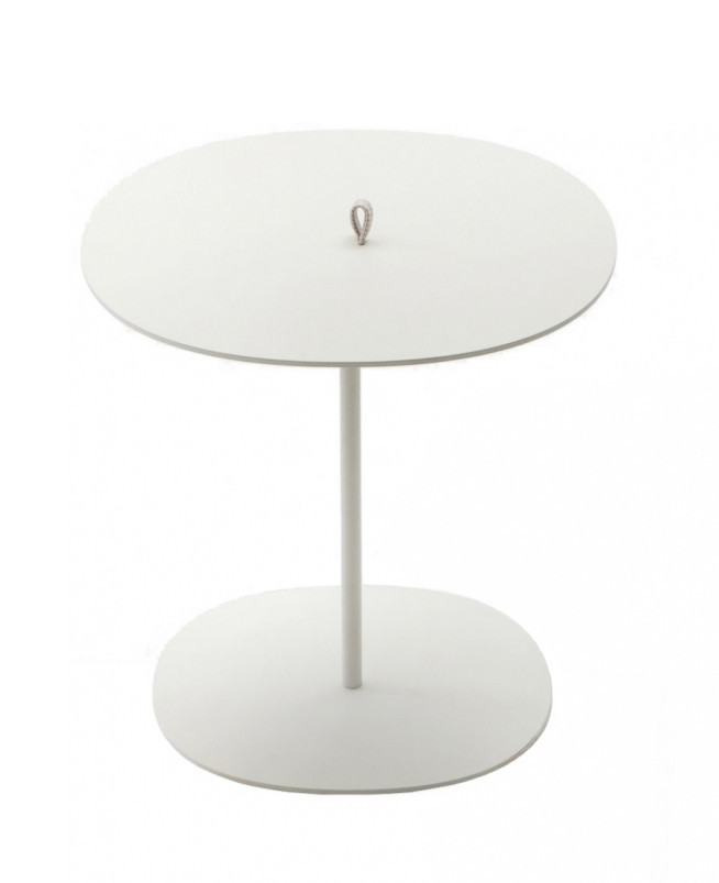 Der Beistelltisch STRAP von Paola Lenti besitzt ein pulverbeschichtetes Metallgestell in der Farbe Avorio (Elfenbein). Mit Ø 50 cm und einer Höhe von 50 cm eignet er sich ideal als funktionales Outdoor-Möbel mit charakteristischer Trageschlaufe.