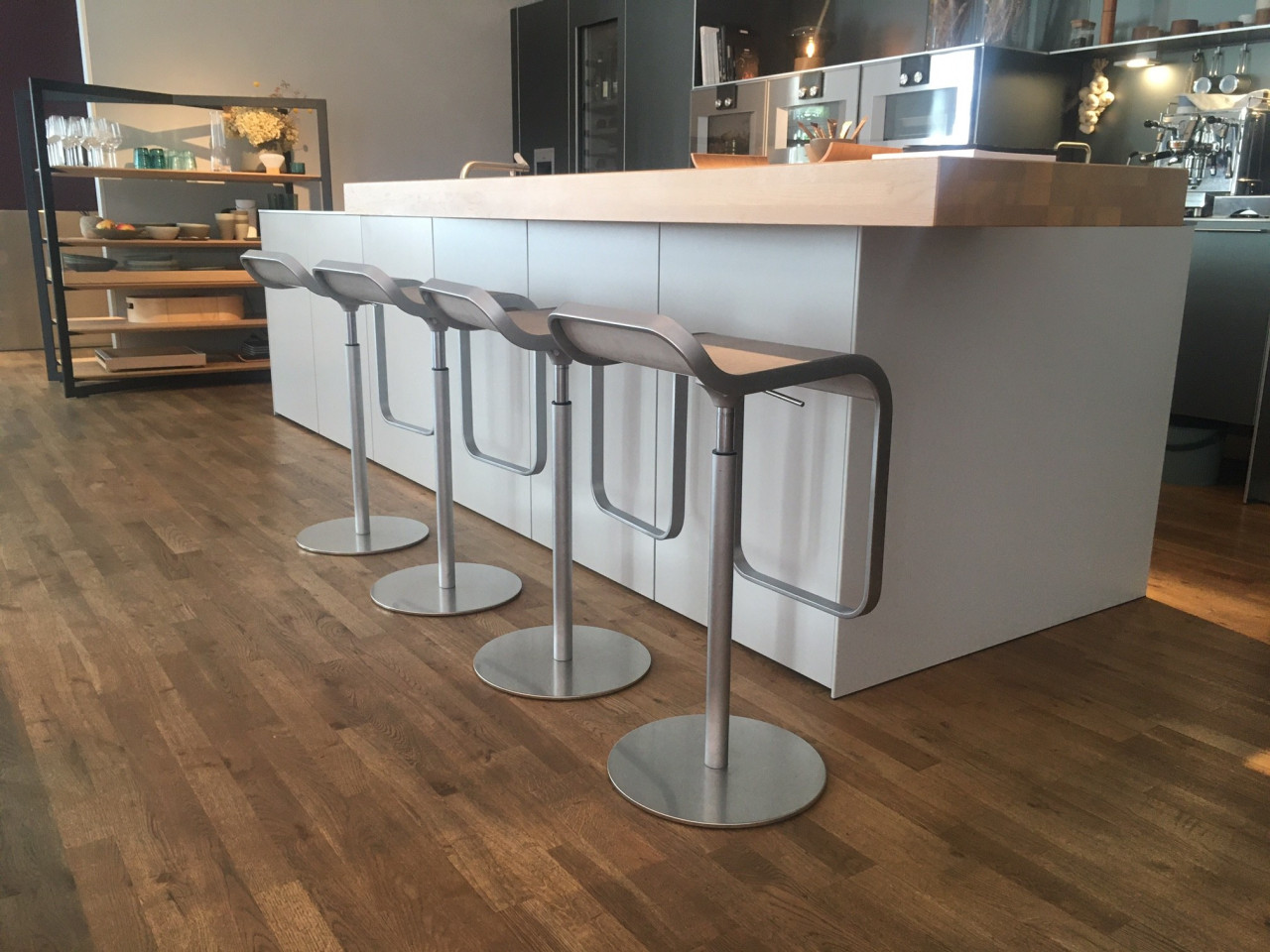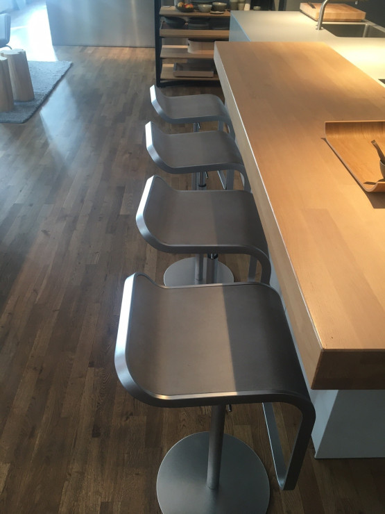 verchromt. Bodenplatte aus Metall überzogen mit Edelstahl mit „Leinenstruktur". Sitz aus formgepresstem Multiplex mit Betonoberfläche