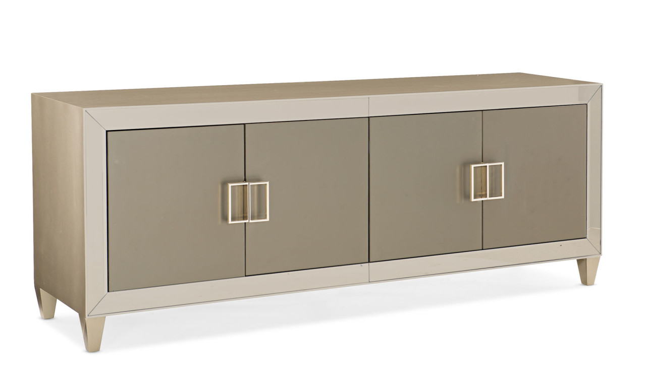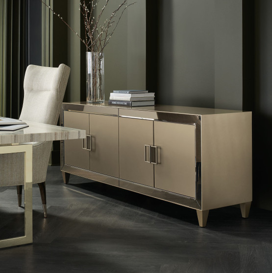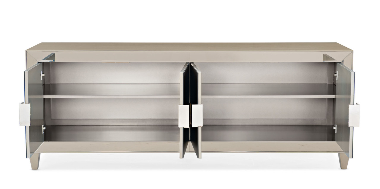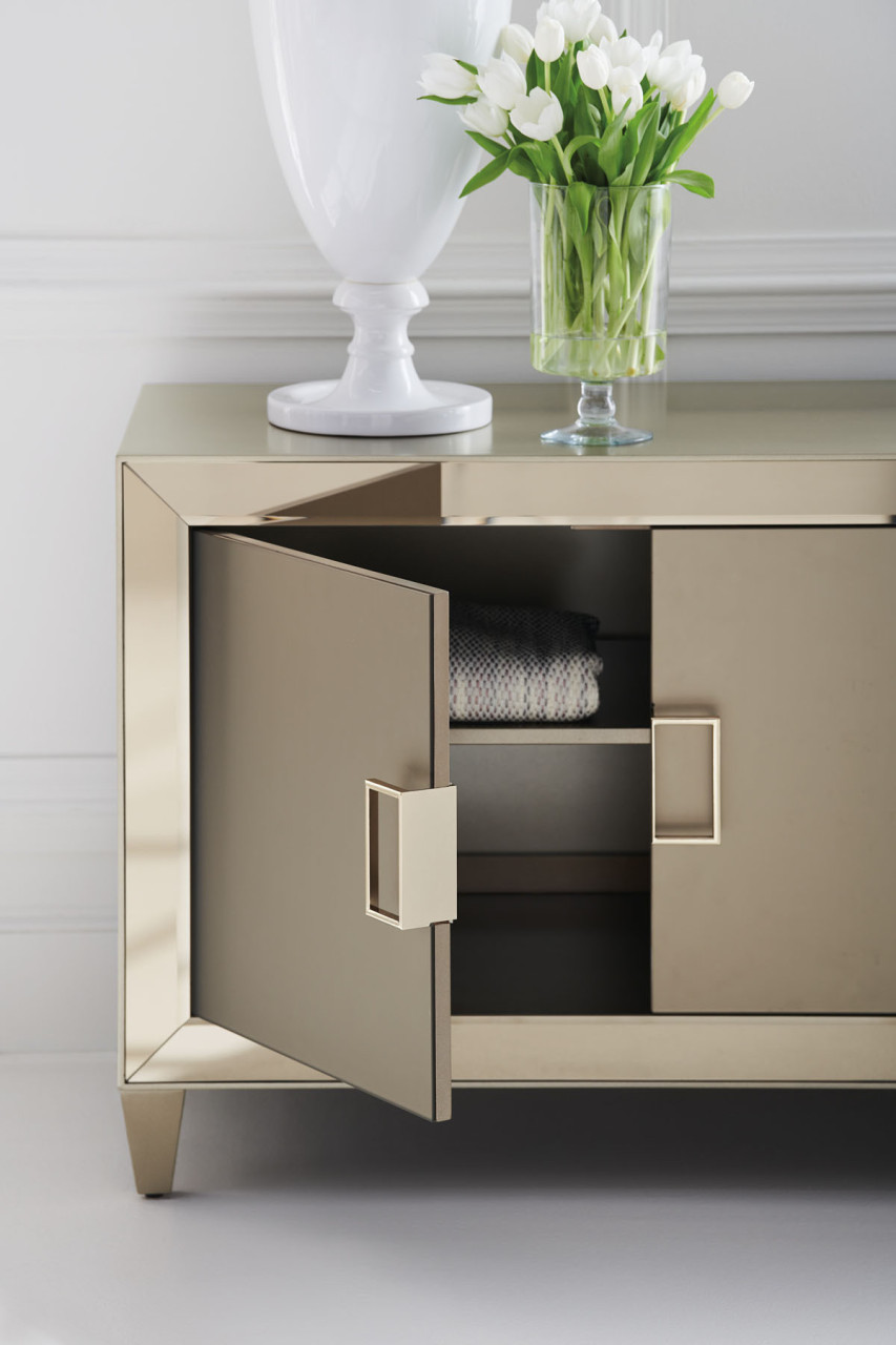 Der MEDIA MOGUL ist ein elegantes TV- und Medien-Sideboard, das Luxus ausstrahlt. Der Korpus in Goldschimmer wird von einem umlaufenden Spiegelrahmen betont. Vier Türen mit mattiertem bronziertem Spiegel und geometrischen Griffen verleihen dem Möbelstück modernen Glamour. Im Inneren, in Austern-Finish, bieten verstellbare Regalböden und Kabelmanagement praktische Lösungen für Technik und Zubehör.