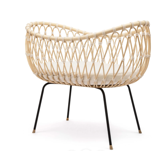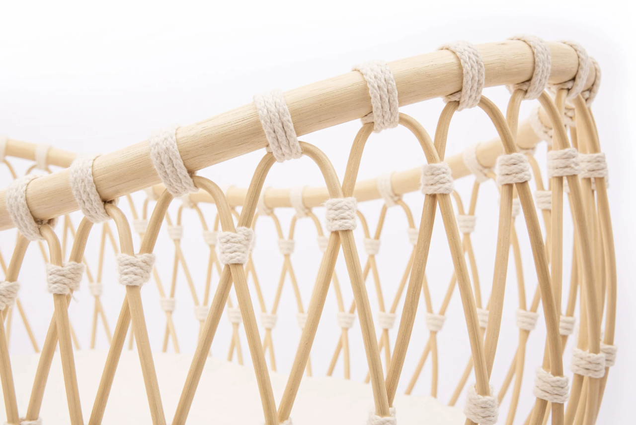 Feine Baumwoll-Seile umschließen jede einzelne Verbindung des Geflechts und verleihen ihm zusätzliche Festigkeit. Die warmen Natur-Farben von Rattan und Baumwolle verbinden sich dabei zu einem faszinierenden Muster und einem feinen Untergestell aus gebogenem Stahl mit Mango-holzfüßen.
