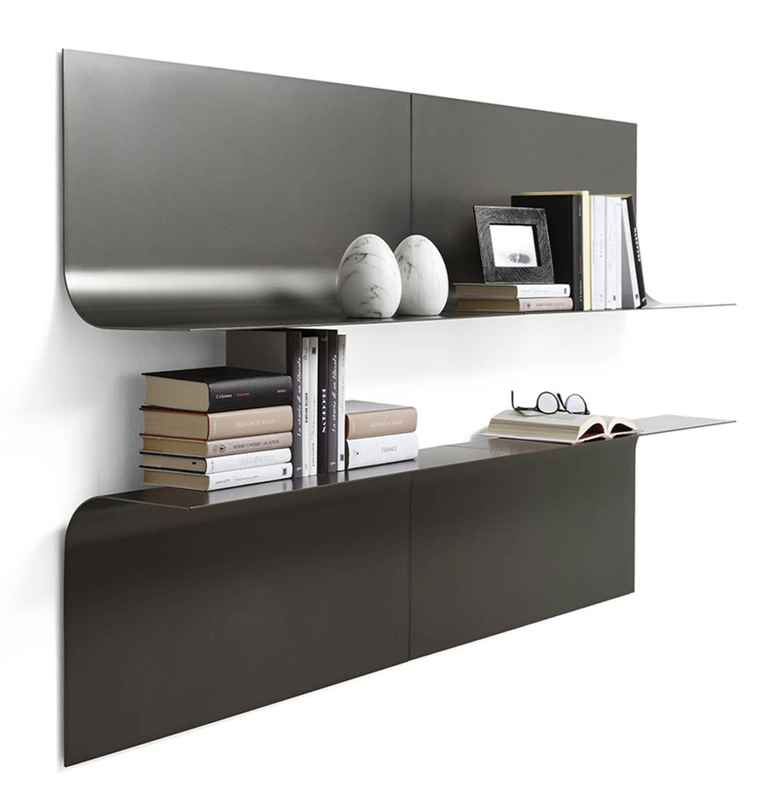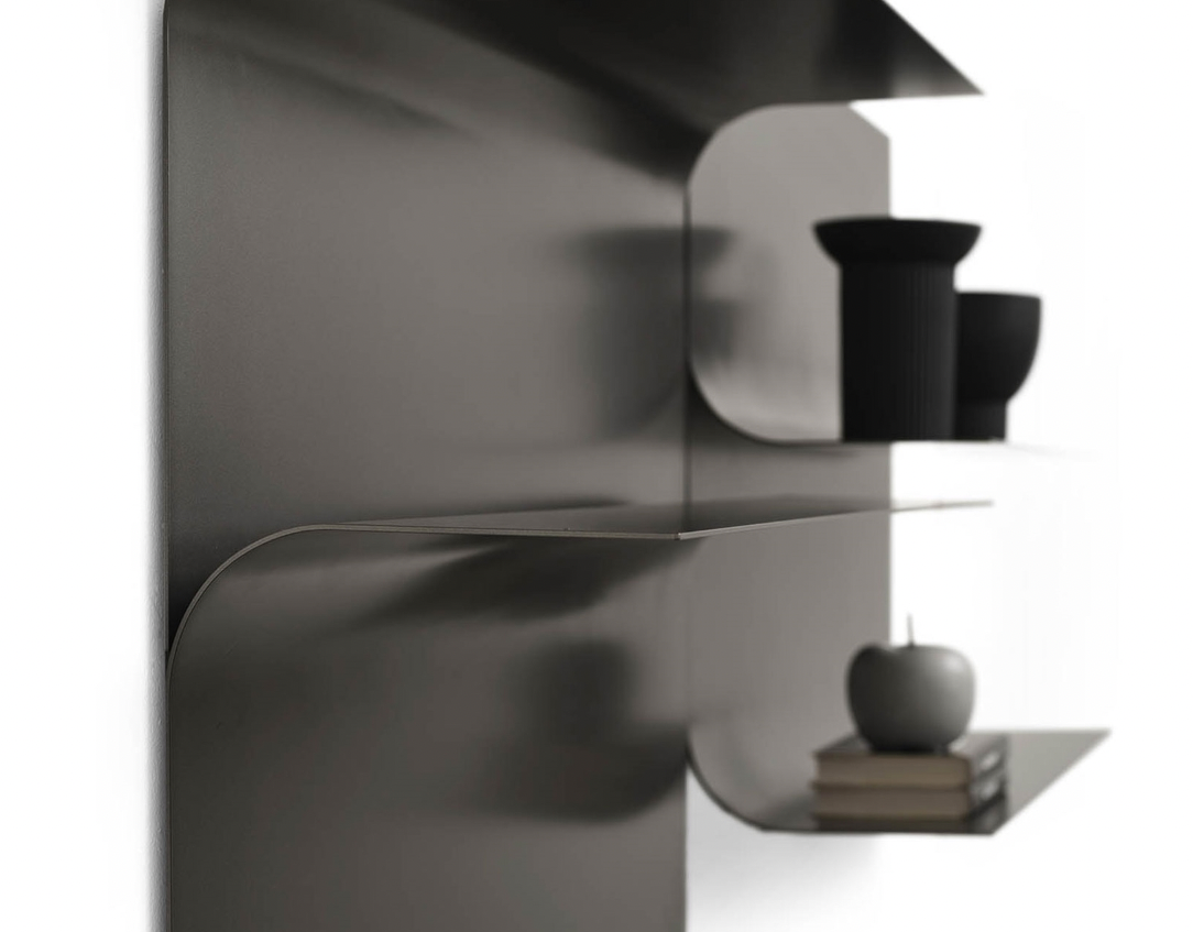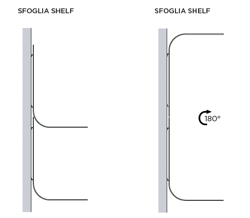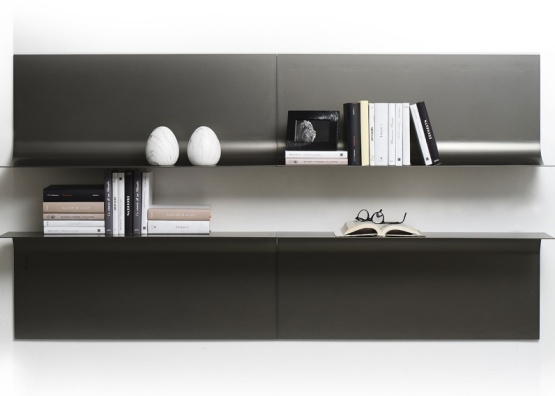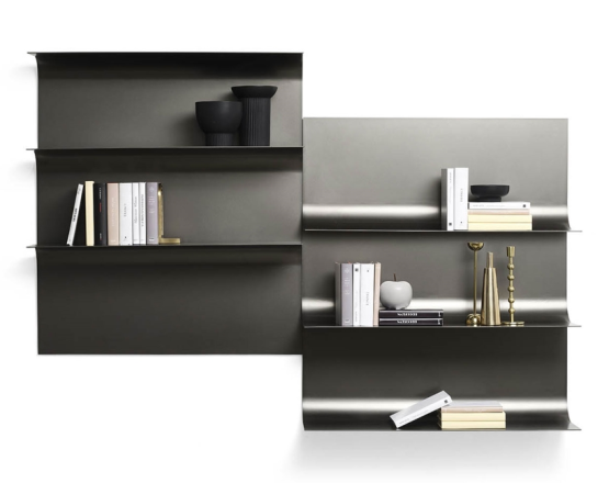 Eine dünne Platte, die sich wie Buchseiten von der Wand löst. Das Ergebnis ist ein formal sehr schlichtes, aber äußerst vielseitiges Element. Mit einem einzigen Modul, das auch kopfüber montiert werden kann, sind zahlreiche Kombinationen möglich.