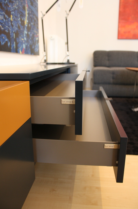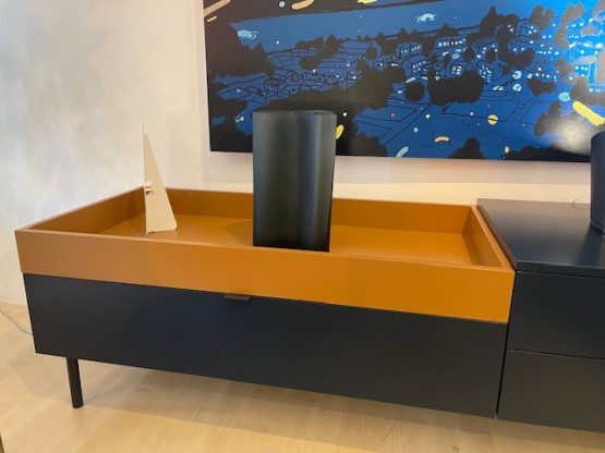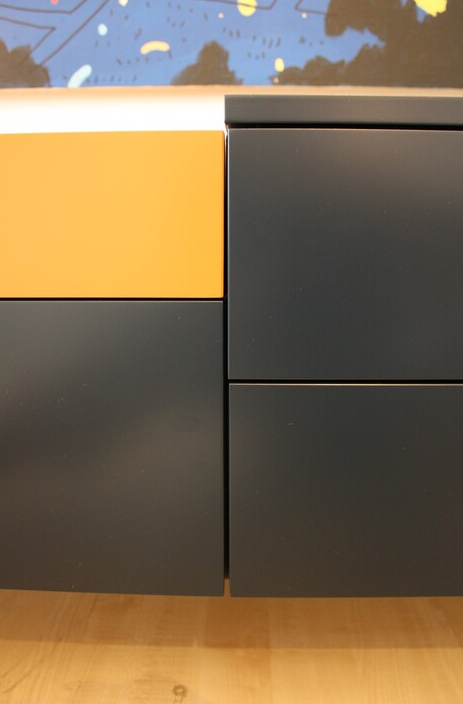 Das angebotene Lowboard verfügt über einen hohen Schubkasten, worauf sich ein farblich abgesetztes Tablar befindet, und über vier kleinere Schubkästen. Öffnen lassen sich die Schubladen mit Hilfe von schwarzen Ledergriffen.