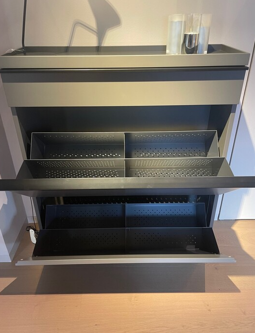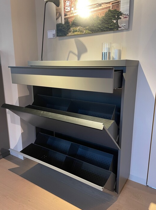 Alle Schuhe auf einen Blick, das bietet der Schuhschrank Basic mit 2 sich synchron öffnenden und schließenden Klappen, sie sind mit einer hochwertigen Federmechanik ausgestattet.