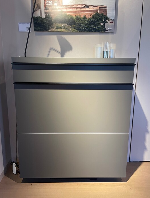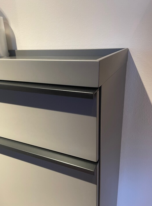 Hängend oder stehend mit Sockel, jeweils mit Wandmontage. Eine große Palette an matten und Hochglanz-Lackfarben steht zur Wahl, die Griffleisten sind entweder in Korpusfarbe lackiert oder aus eloxiertem Aluminium. Zudem gibt es diverse Optionen für Abdeckplatten, z. B. auch ein Abdecktablett in passender Lackfarbe mit Glaseinlegeplatte - ideal zur Ablage von kleinen Alltagsdingen im Entree. Funktional, addierbar und individuell.