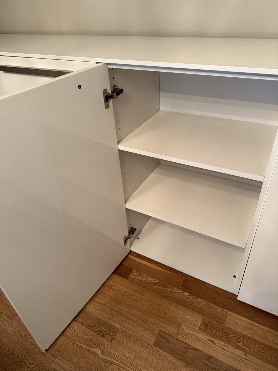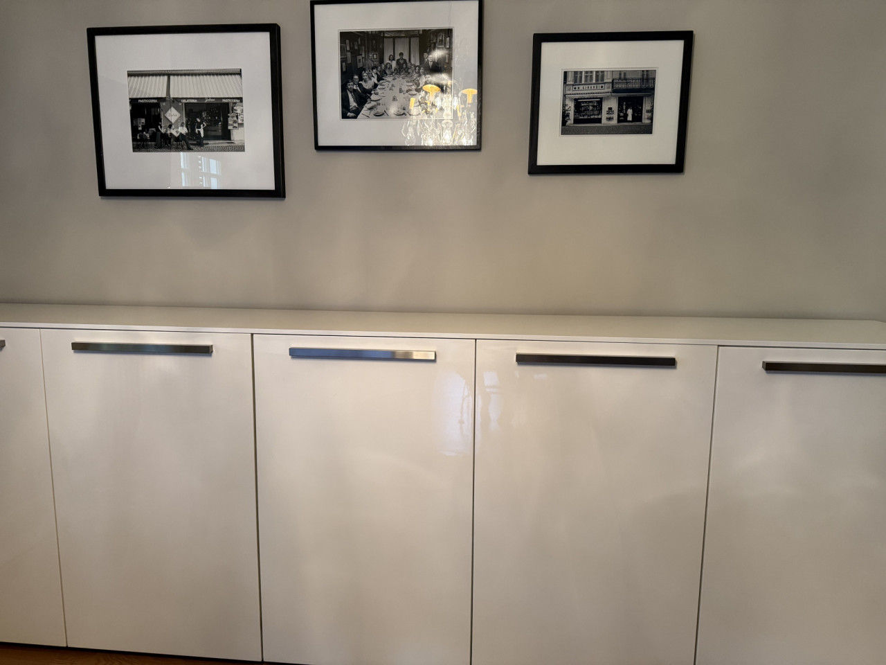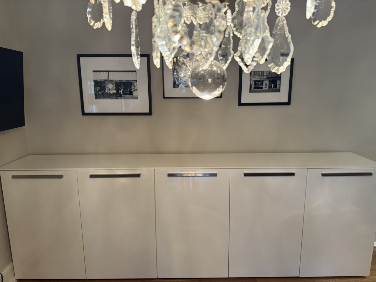 Das Sideboard zeichnet sich durch ein modernes, zeitloses Design mit klarer Formensprache aus. Es besteht aus 5 einzelnen Elementen mit je 2 variablen Einlegeböden was reichlich Stauraum bietet. Durch die Füsse wirkt es leicht. Auf den Türen sind elegante Chrom Griffe. Die Platte ist lose und 0,7 cm dick und 205 cm lang.