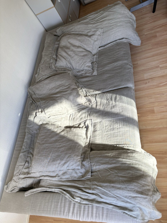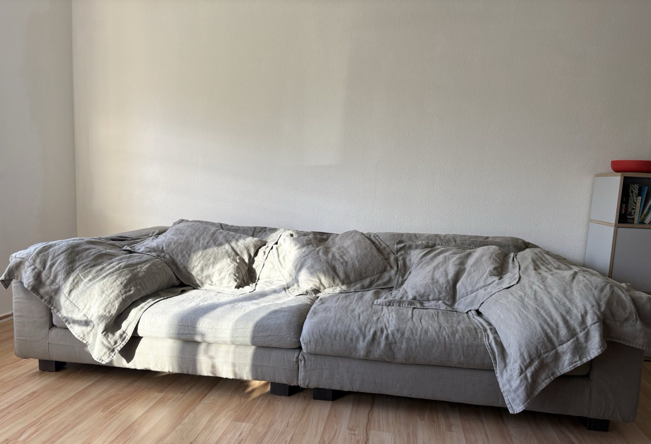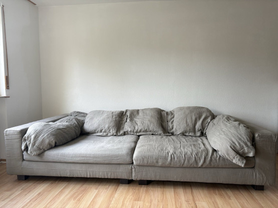 "Weich wie eine Wolke und großzügig in den Formen, wo man sich bequem auf den großen mit Leinen bezogenen Pölster hinsetzen oder ausstrecken kann. Diese Kissen bestimmen das Sofa und machen es zu einem idealen Platz zum Relaxen und für Geselligkeit."