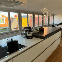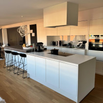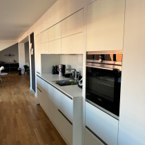 Große Küche mit 2 Hochschränken und 4 Unterschränke á 60 cm breit an der Wandseite. Die Gesambreite bei der Küche an der Wandseite ist 360 cm breit.