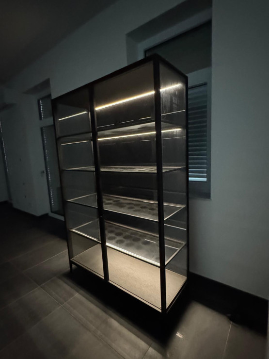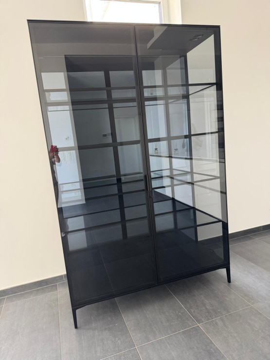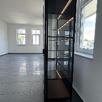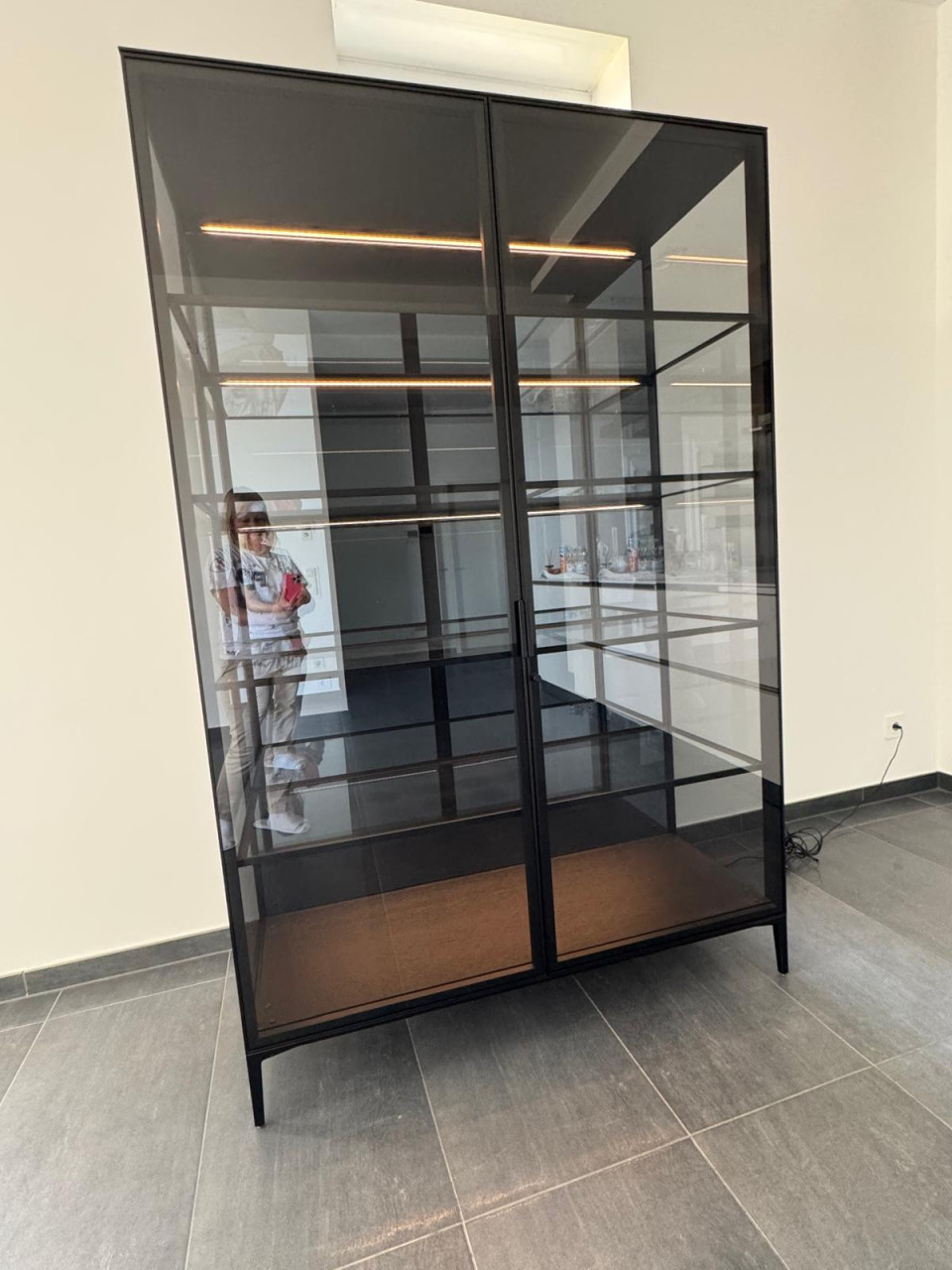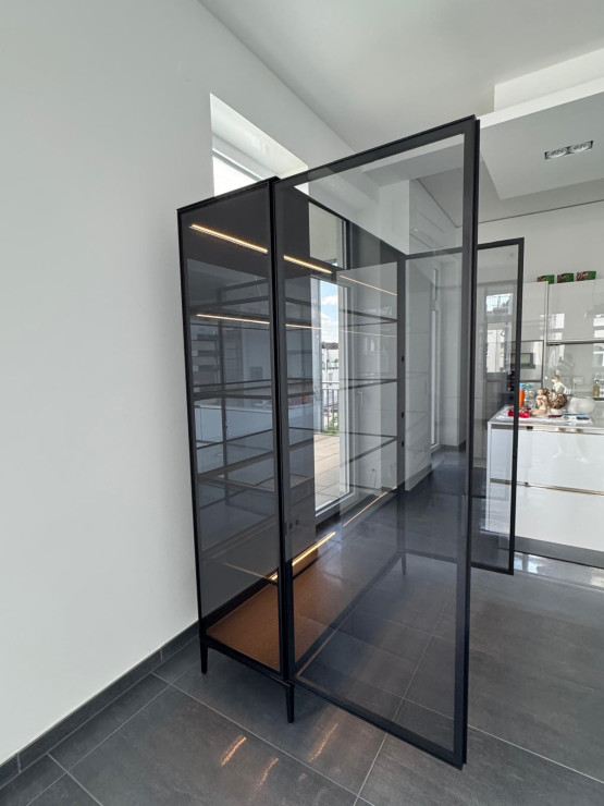 graues Glas, Rückwand verspiegelt, Struktur Nero, Holzboden Rovere Nero