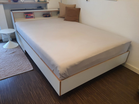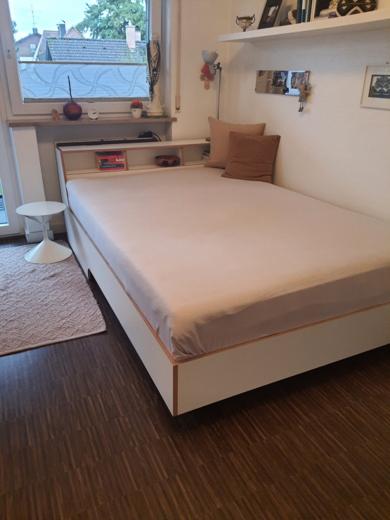 verkauft wird ein neuwertiges Designer Bett Mod Slope in hochwertigem Birkenschichtholz mit weißer CPL-Ausführung, das durch seine harmonische Ausstattung überzeugt. Die offenen Fächer im Kopfteil integrieren Klappen mit push-to-open Mechanik, die viel verdeckten Stauraum bieten
