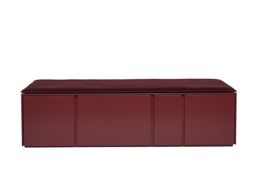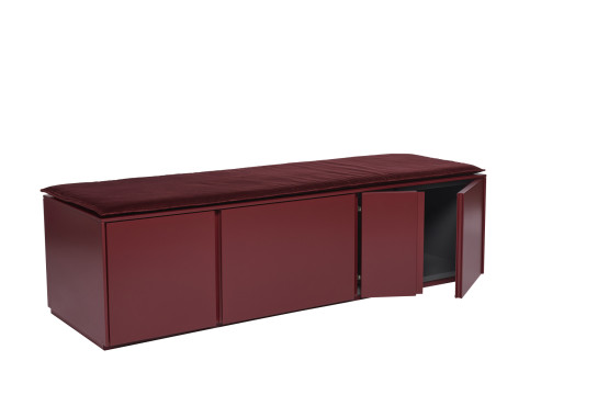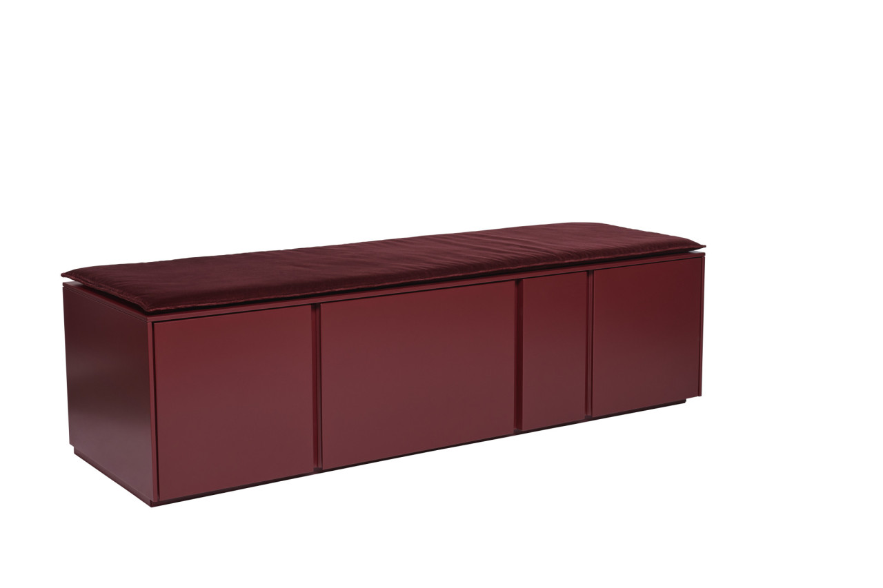 Hier angeboten wird eine Bank mit Schubkasten und zwei Türen sowie einer Sichtrückwand. Lackiert ist das Möbel in der Farbe „wine red“ und es kommt mit einem Sitzpolster im Samtstoff „burgundy“