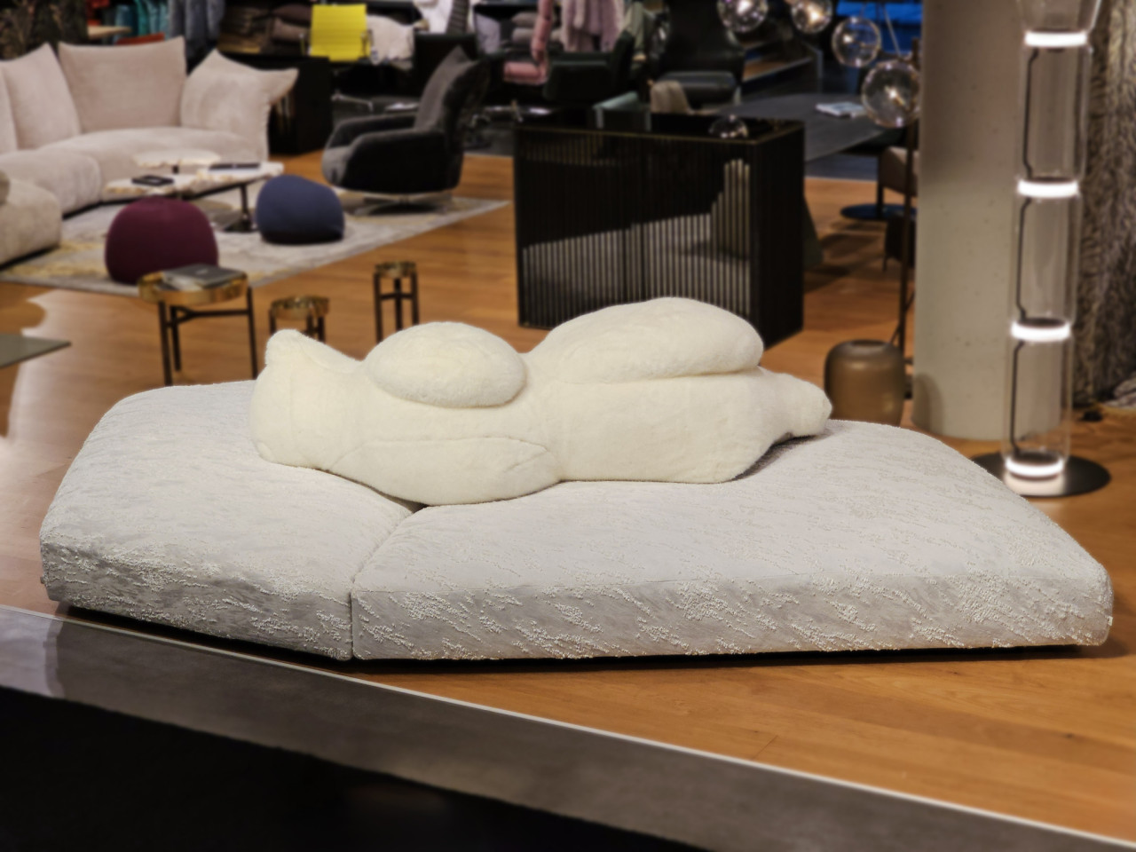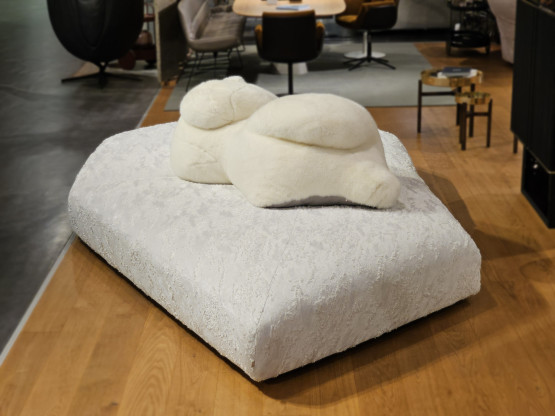 Als Rückenlehne dient ein seitlich liegender Eisbär aus Polyesterfaser, bezogen mit hochwertigem Kunstpelz. Für ramsaier living today wurde dieser Eisbär als exklusive Sonderanfertigung um 10 Prozent verkleinert und speziell für dieses Modell angepasst. Dadurch entsteht ein echtes Unikat, ein 1 of 1 innerhalb der Edra Pack Kollektion.