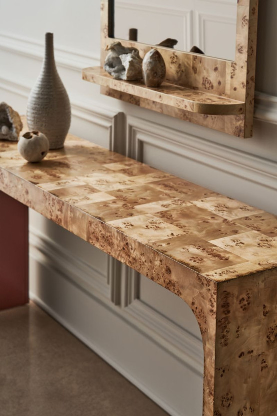 Eine beeindruckende Design-Konsole aus der Caracole Classic Collection, gefertigt aus Asian Hardwood und veredelt mit einem exklusiven Mappa Burl Furnier (Naturbraun Maserung), das durch seine ausdrucksstarke Zeichnung lebendige Hell-Dunkel-Effekte erzeugt.