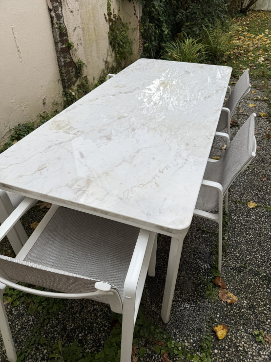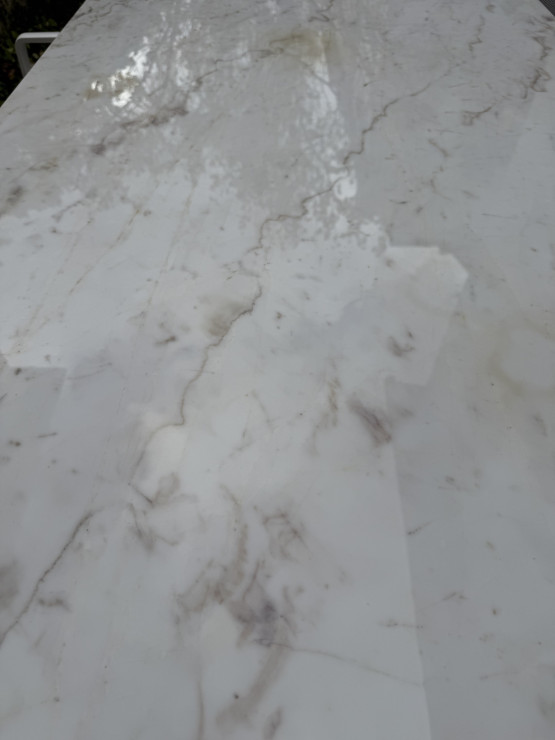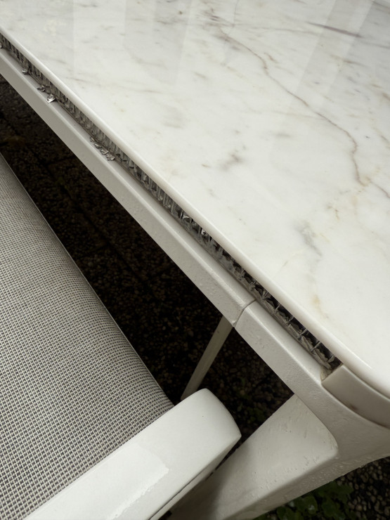 Hinweis zum Tisch: Die Marmorplatte selbst ist unbeschädigt und absolut in Ordnung. An der seitlichen Einfassung gibt es jedoch einen Ausbruch (siehe Detailfoto).