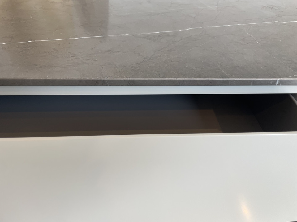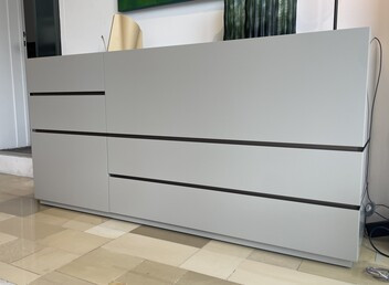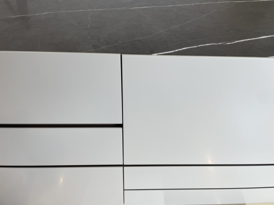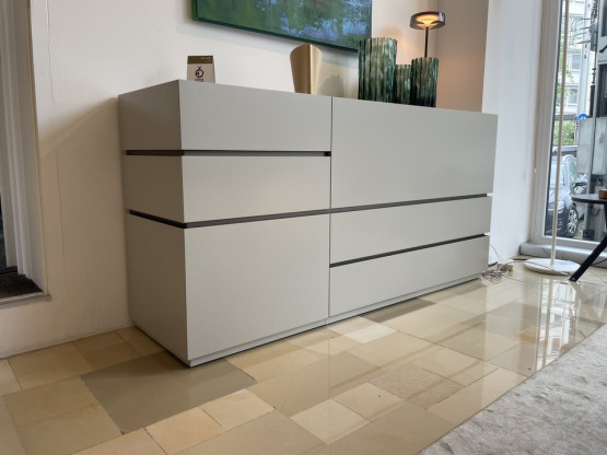 Das Interlübke Sideboard Just Cube in Muschel besticht durch seine Eleganz. Es kombiniert edle Bronze metallic Griffe mit luxuriösen Kalkstein Grafite Brown Deckplatte , die zusammen ein zeitloses Design ergeben.