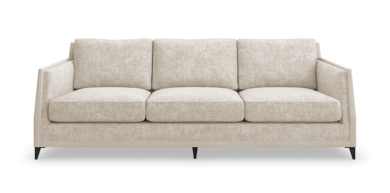 Ein klassisches Silhouetten-Design mit Art Deco-Einflüssen, dieses vielseitige Sofa vereint eine präzise maßgeschneiderte und zugleich wunderschön abgenutzte Ästhetik in einem distressed Chenille-Stoff. Die dezent betonten Winkel und das elegante Profil werden durch einen Mikrofaserbesatz ergänzt, der einen tonal abgestimmten Kontrast und Textur bietet und warm durch tapered Füße aus gebürstetem, tiefbronzefarbenem Metall abgerundet wird.