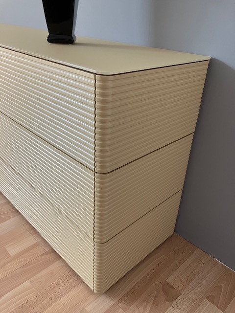 Ausführung: Lack Mandel 461,Rillenfront und Seitenwange, Abdeckplatte Glas gefrostet,