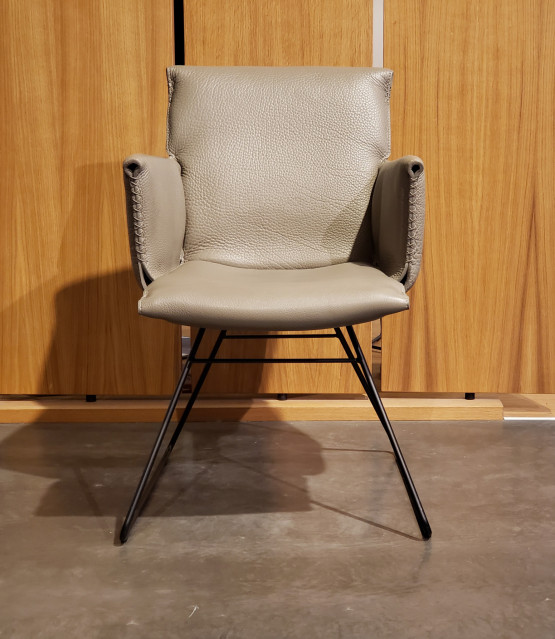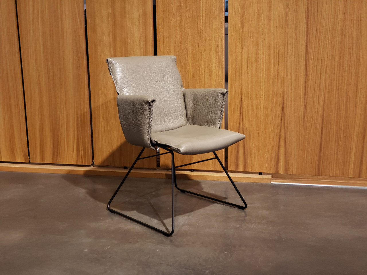 Beginnend mit dem filigranen Untergestell aus Stahl in Kufenform, das in einem edlen Schwarz matt daherkommt, wird hier ein solides Fundament für den großzügigen Sitzbereich geschaffen. Die dünne Drahtkonstruktion dient als formbildender Rahmen, der die Essenz des DS-515 definiert. Über diesen Rahmen ist eine luxuriöse, gepolsterte Lederhusse in einem sanften Beigeton gezogen, die den Stuhl mit einer Aura von Premium-Qualität und feinem Geschmack umgibt.