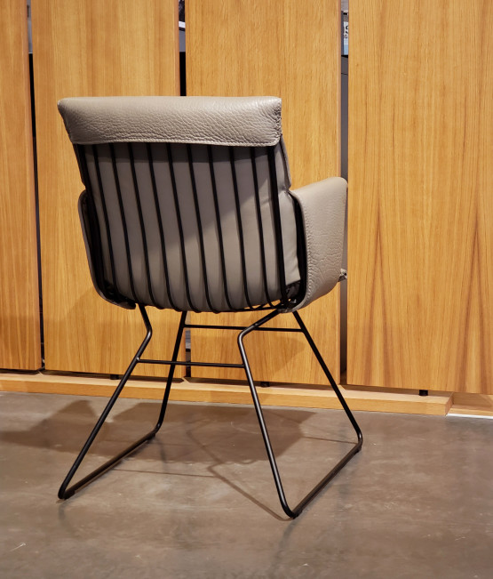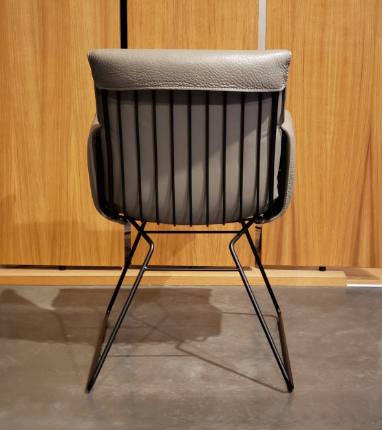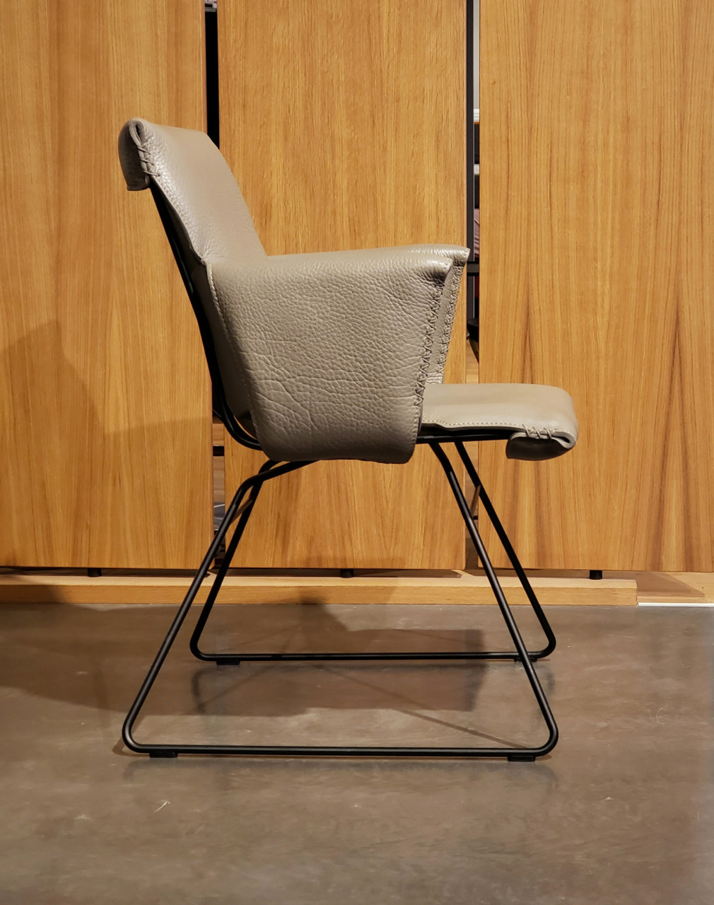 Ein besonderes Augenmerk verdient das Leder selbst: Gefaltet und sorgfältig umgeschlagen, wird es durch meisterliche Ledernähte und durchdachte Details in Szene gesetzt. Der Textileinsatz im Rückenbereich verleiht dem Stuhl nicht nur eine zusätzliche Textur, sondern auch eine markante Prägung, die seine Identität unterstreicht.