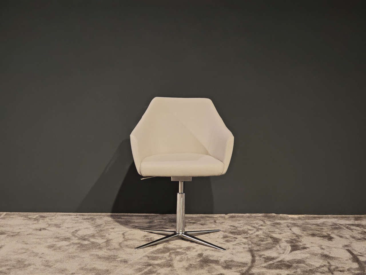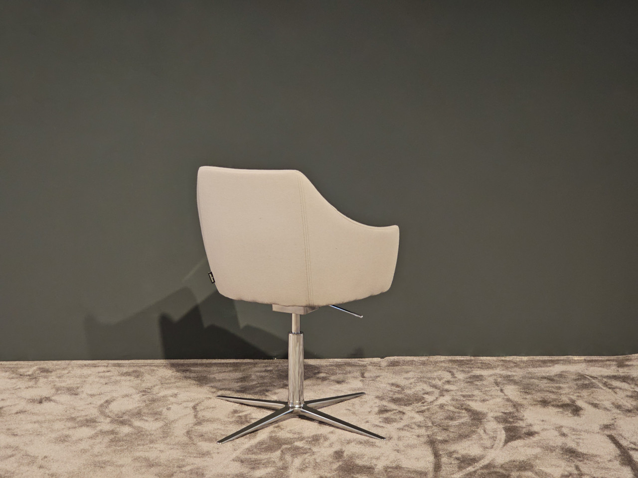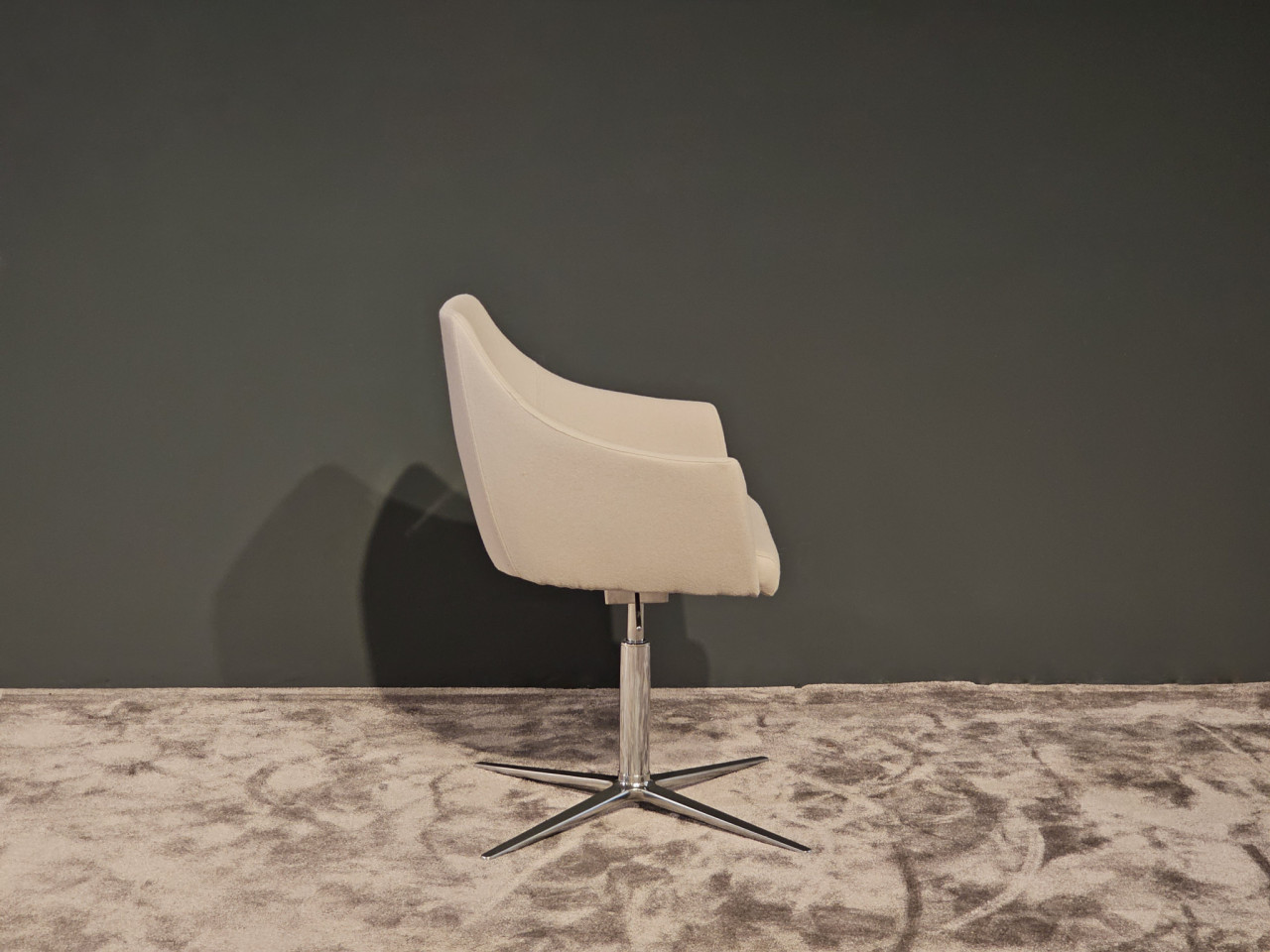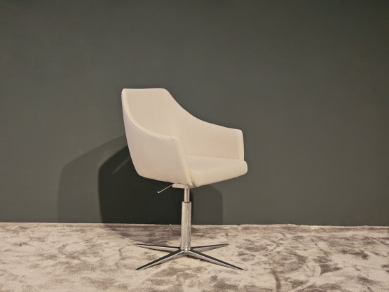 Sein filigranes Vier-Fuß-Gestell, meisterhaft in poliertem Aluminium ausgeführt, bildet ein harmonisches Gegenstück zum edlen Stoffbezug. Das schimmernde Finish des Aluminiums reflektiert das Licht auf dezente Weise und unterstreicht die feinen Konturen des Hockers.