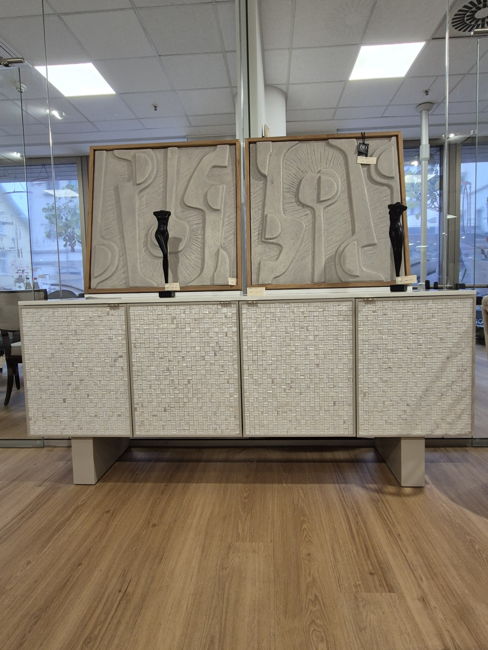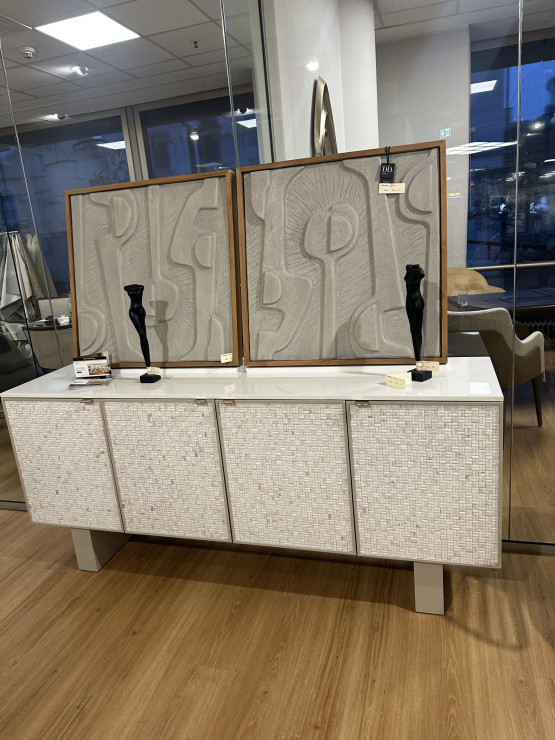 Dieses exklusive Sideboard besticht durch eine Verkleidung aus dreidimensionalen Mosaiksteinen aus echter Perlmuttschale, kunstvoll in einem Korbmuster arrangiert. Die schimmernde Oberfläche erzeugt einen außergewöhnlichen Glanz und macht das Möbelstück zu einem echten Blickfang.