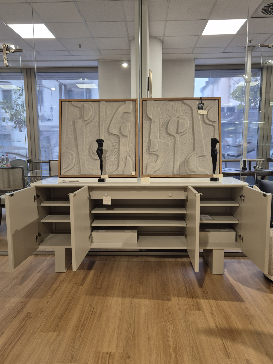 Variabel ausrichtbare Beine ermöglichen zwei Höhen: vertikal montiert erreicht das Sideboard ca. 86 cm, horizontal montiert ca. 72 cm – ideal auch als stilvolles Entertainment-Möbel. Eine helle Verbundsteinplatte rundet das Design elegant ab. Hinter vier Türen bietet das Sideboard großzügigen Stauraum und setzt in Wohn- und Essbereichen ein luxuriöses Statement.