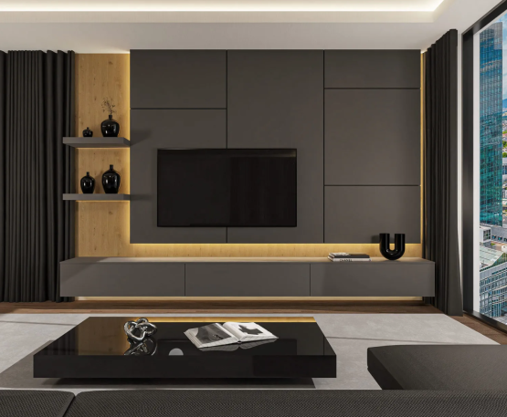 Das hängende Lowboard mit drei Klapptüren bietet großzügigen Stauraum und wirkt dank seiner schwebenden Konstruktion elegant und leicht. Darüber befindet sich ein großes TV-Paneel (300 cm breit), das ideal für Fernseher über 65 Zoll geeignet ist. Ergänzt wird das Design durch zwei schwebende Wandregale, die Platz für Accessoires, Bücher oder Auszeichnungen bieten.