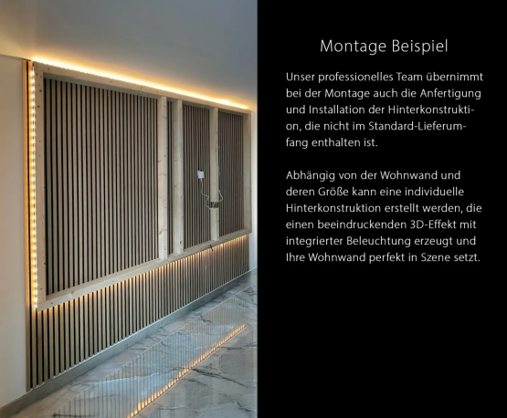 Um den beeindruckenden 3D-Effekt der Wohnwand zu erzielen, wird die Installation auf einer speziell angefertigten Hinterkonstruktion erforderlich. In den Fotos finden Sie ein Beispielfoto. Diese Hinterkonstruktion ist nicht im Lieferumfang enthalten, kann jedoch von unserem Montage-Partner fachgerecht angefertigt und montiert werden, wenn eine optionale Montage (Preis 880€) von uns zusätzlich gewünscht wird, lassen Sie es uns einfach wissen damit wir Ihnen diese mit anbieten.