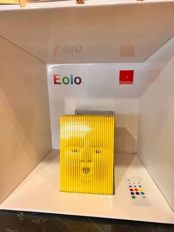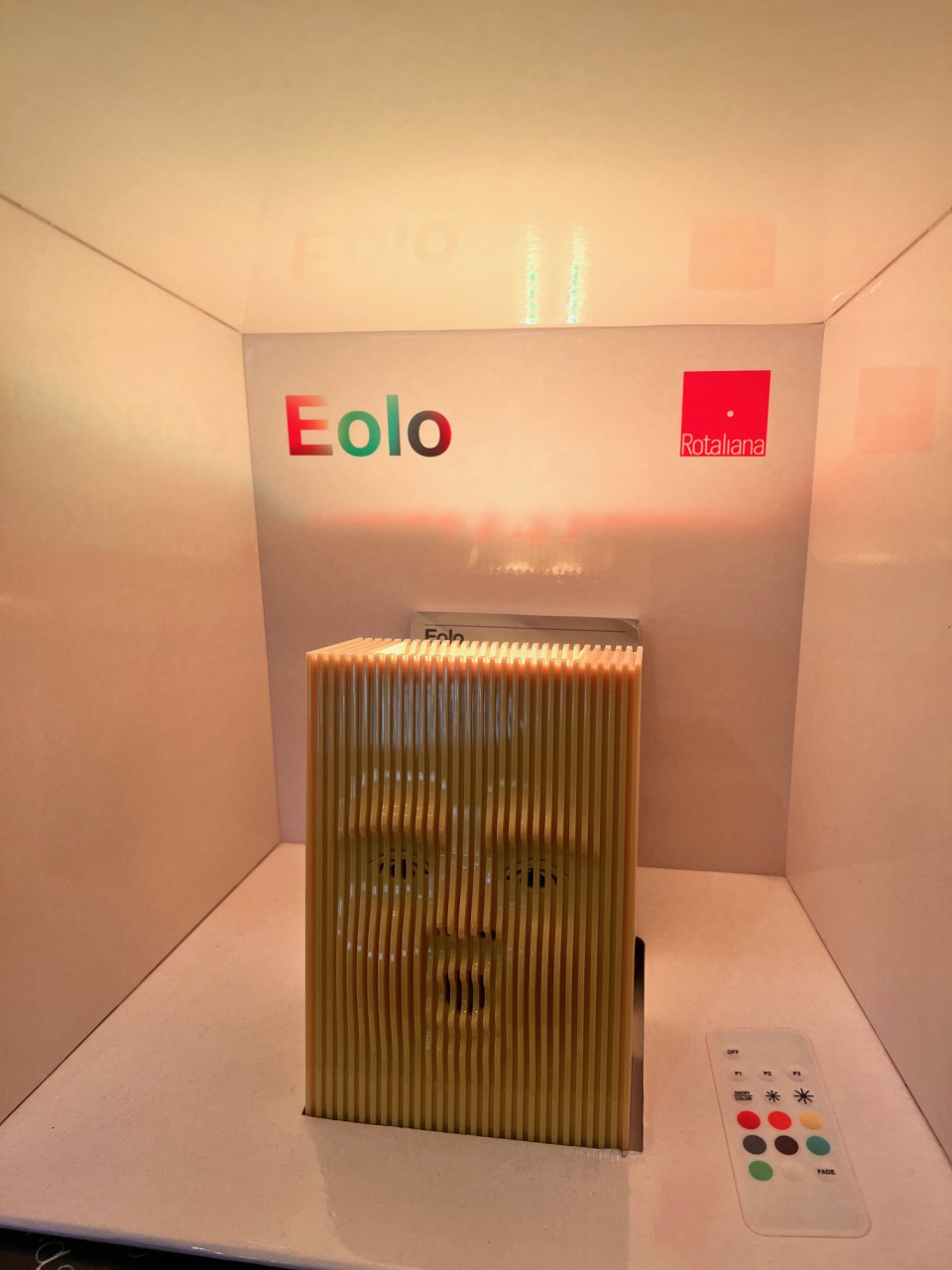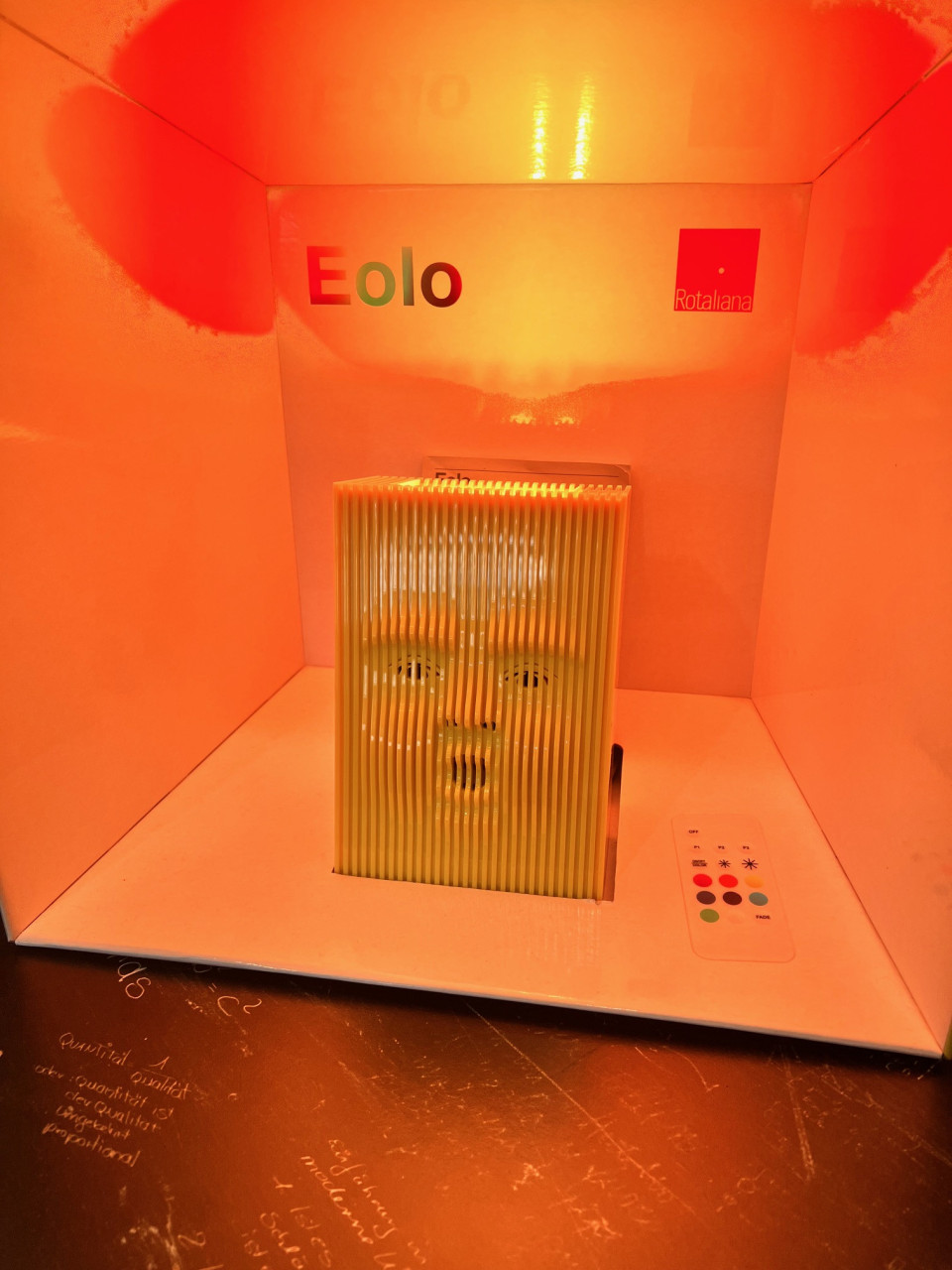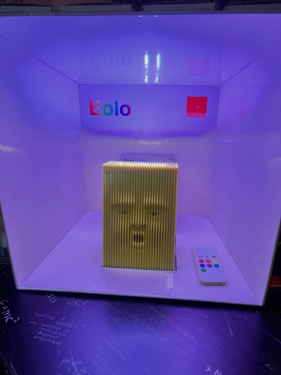zur Betrachtung oder als Hintergrund in Wohn- oder Büroräumen positioniert, verwandelt Eolo den Raum, um das persönliche Wohlbefinden zu begünstigen. Es handelt sich um ein Parallelepiped, das von dünnen Lamellen durchschnitten ist, die sich verformen und die Züge eines Gesichts modellieren, das duftende Luft in den Raum bläst. Eolo nutzt die Technologie der RGB-Leds zum Mischen des Lichts im gewünschten Farbton entsprechend dem jeweiligen Gemütszustand. Die Lampe ist mit einer Fernsteuerung ausgestattet, mit der Farbe, Lichtintensität und abgegebener Duft auch auf Distanz geregelt werden können. Eolo „bläst“ den wohltuenden Duft der gewählten Essenz in den Raum: Zitrusfrüchte, Gewürze… Der Luftstrom wird durch einen kleinen Ventilator erzeugt. Die Duftstoffe sind Feststoffe, die durch reine Ventilation ohne Rauch oder Lösungsmittel in den Raum getragen werden. Die angebotenen Aromen schaffen eine Duftpalette, aus der nach persönlichem Geschmack oder je nach Zweckbestimmung gewählt werden kann.