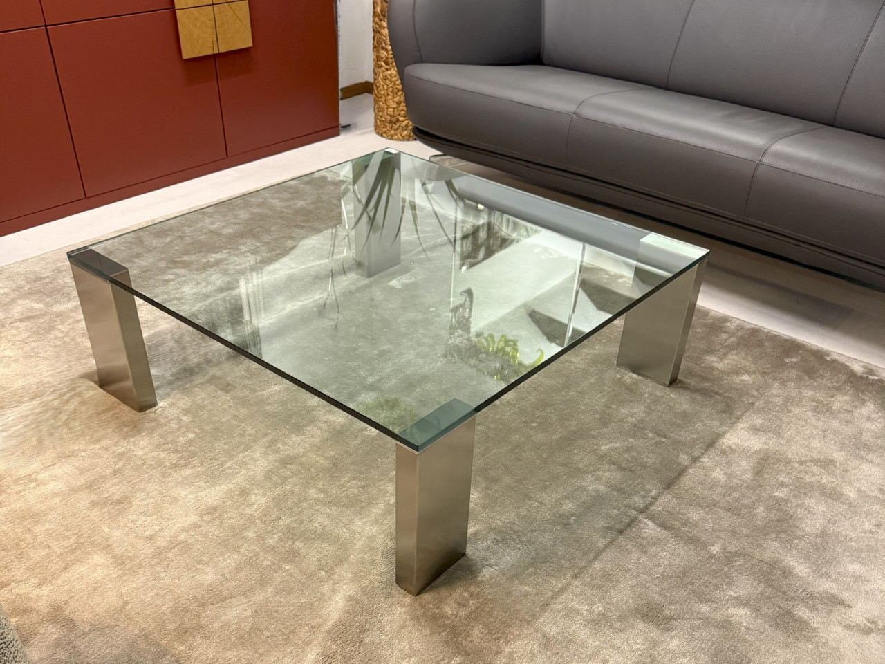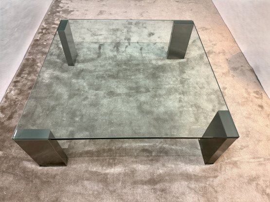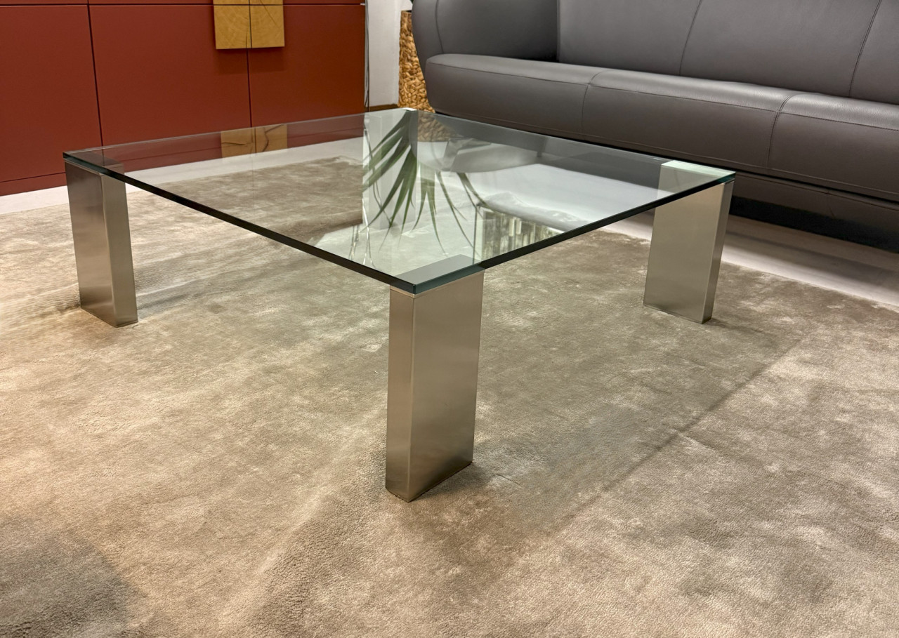 Der elegante Glascouchtisch „Giava“ von Solmet überzeugt durch zeitloses Design und hochwertige Materialien. Die quadratische Kristallglasplatte (100 × 100 cm) ruht auf einem edlen Edelstahlgestell in satinierter Ausführung, das Stabilität mit moderner Leichtigkeit verbindet.
