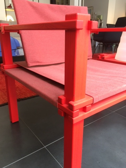 8 Holzplanken, 4 Vierkantstäbe, 2 Stoffbahnen. Alles streng im rechten Winkel verbaut. Die Stoffbahn über Kreuz gelegt. 2 Metallklammern. Punkt. Dass so minimalistische Bauteile zusammengefügt ein derart lässiges Möbelstück ergeben, ist schon das erste Phänomen. Dass dieses zudem aussieht, als sei es eben erst kreiert worden, das zweite. Denn Designer Gerd Lange schuf den identischen Vorgänger des Farmer Sessels bereits im Jahr 1965.